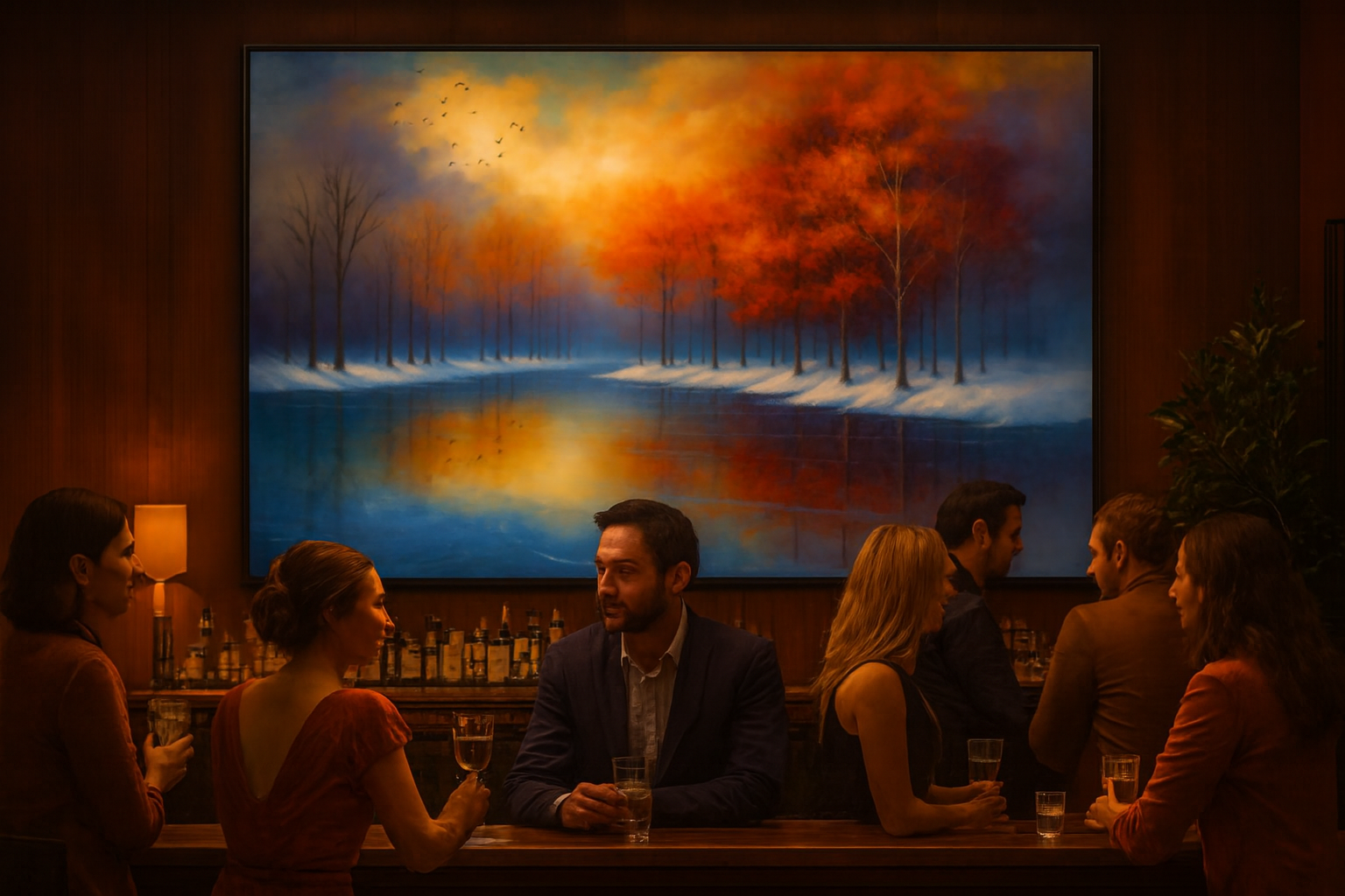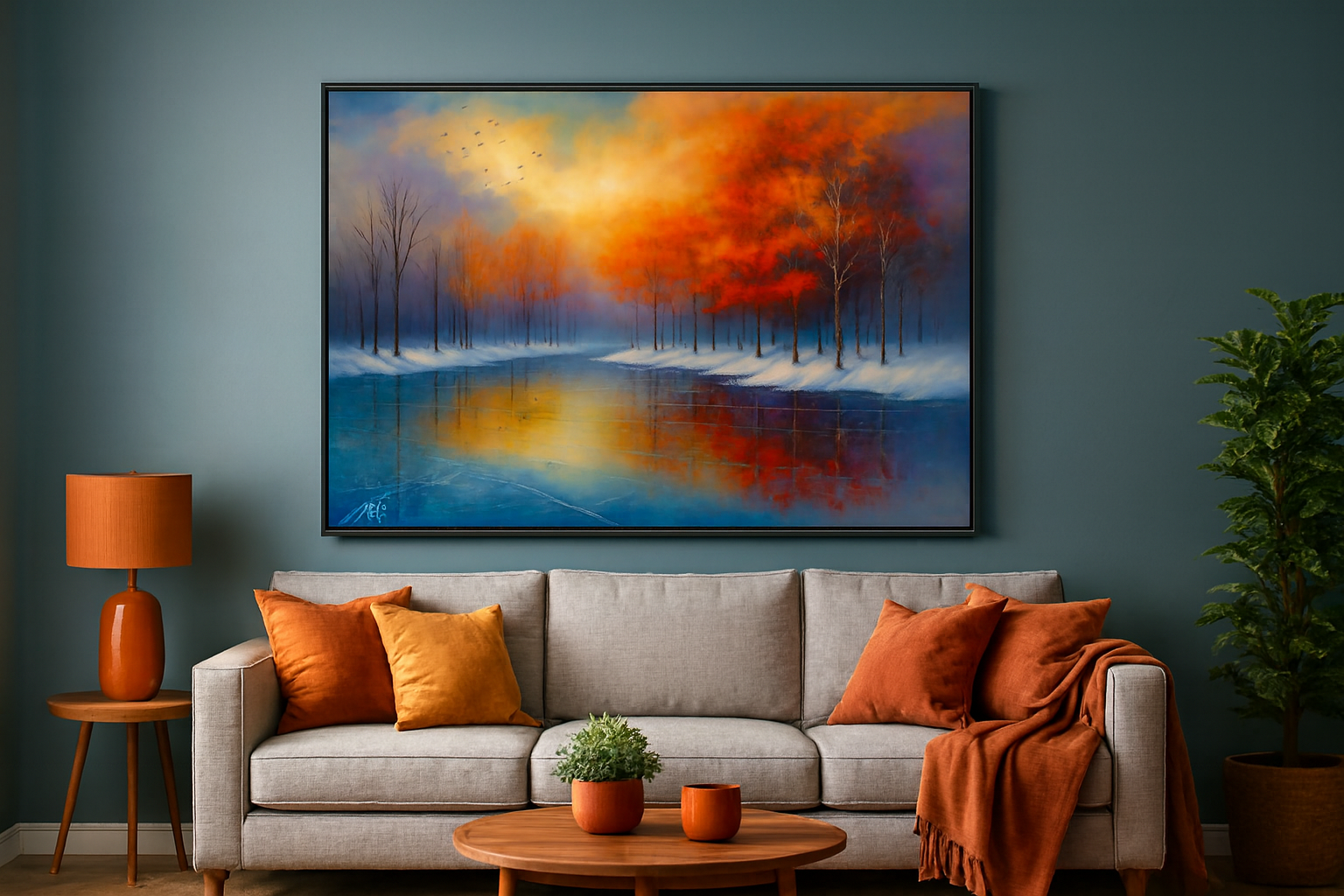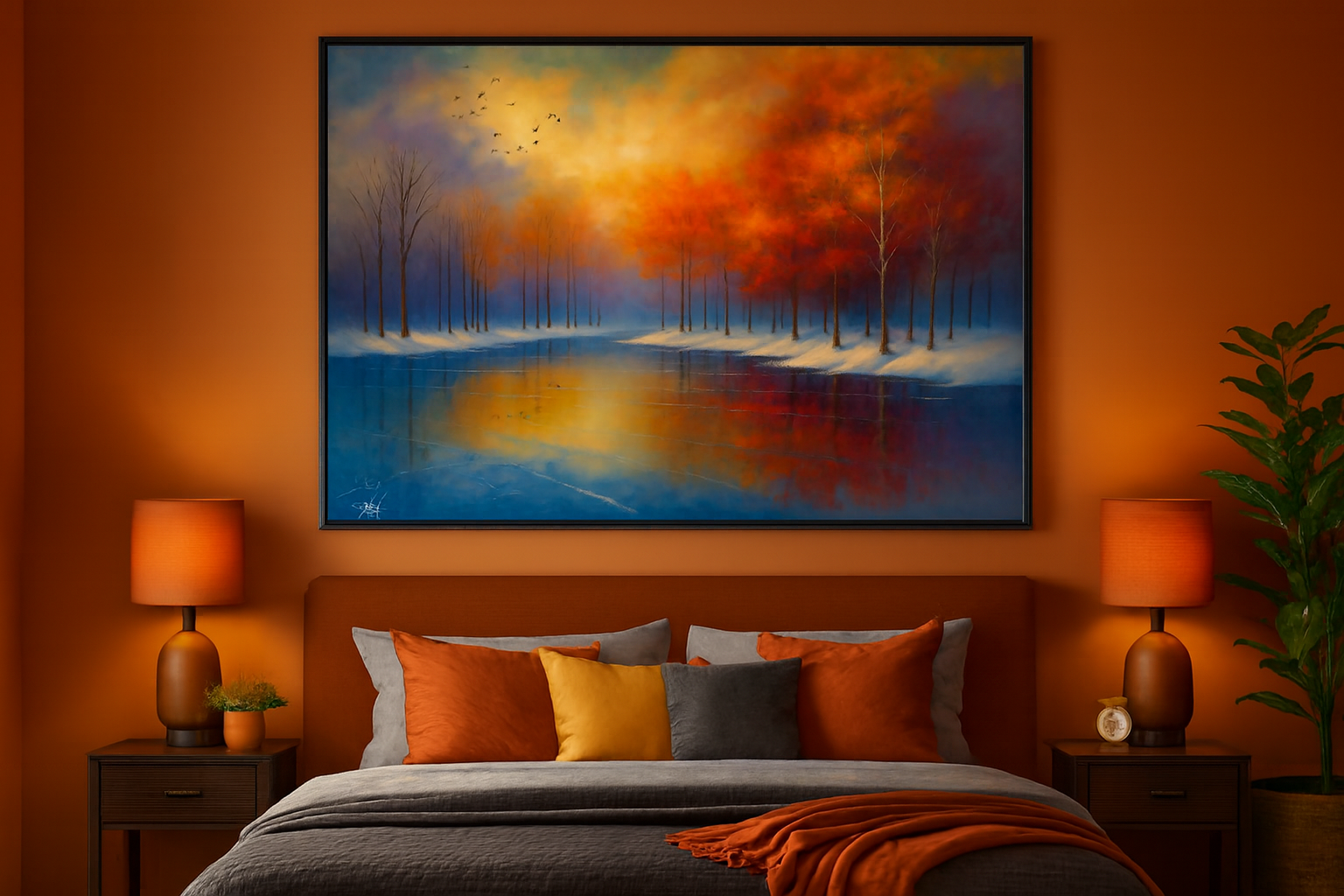 A serene lake reflects vibrant autumn trees and a colorful sky. The line of barren trees contrasts with fiery reds and oranges of fall foliage.