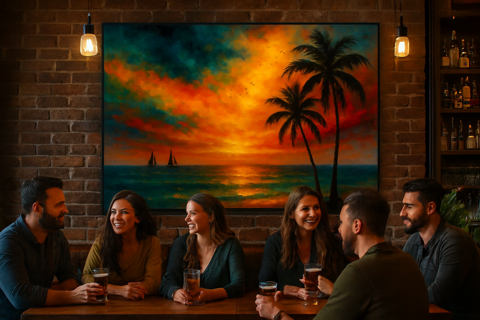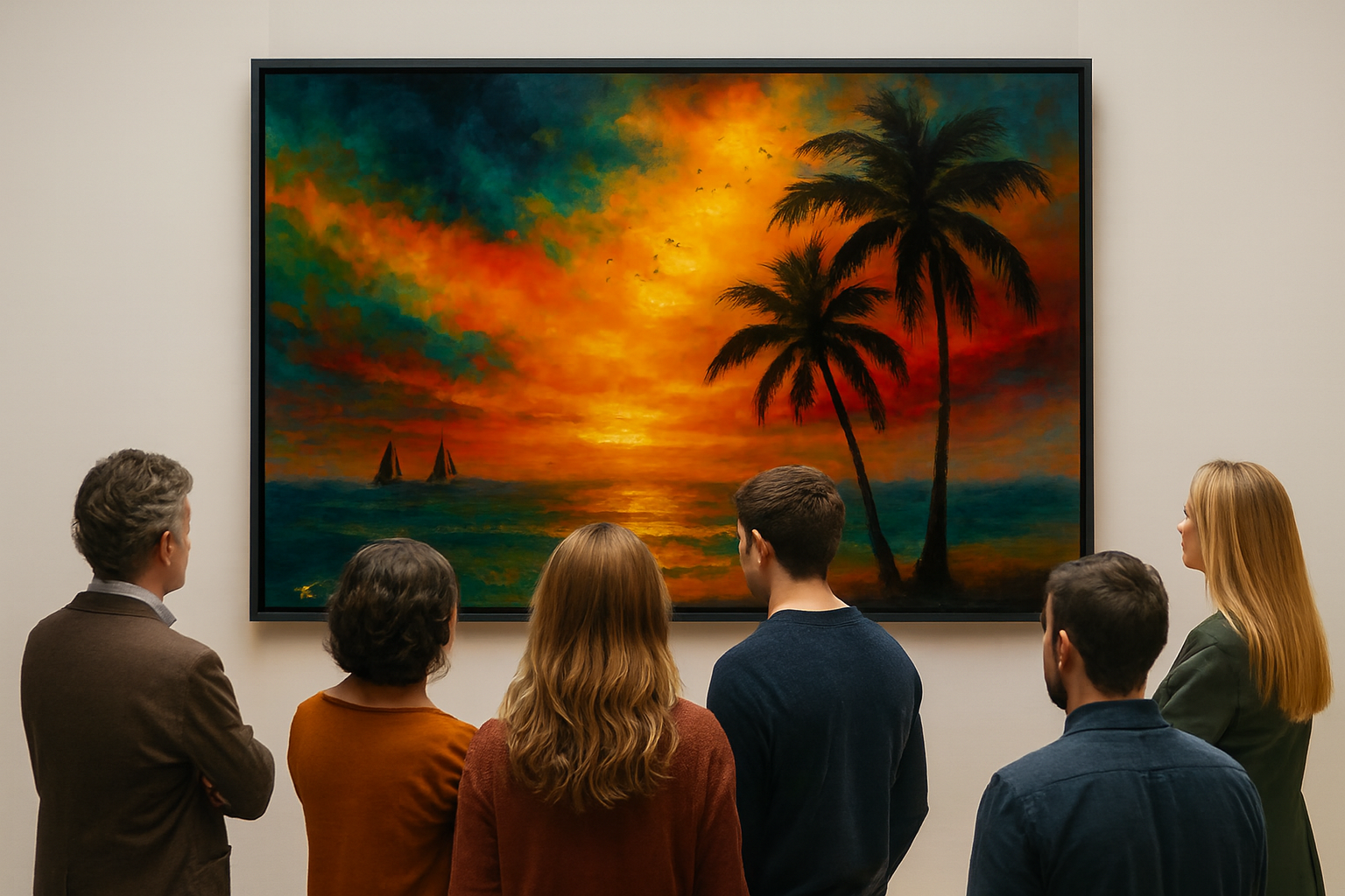 A vibrant sunset casts brilliant colors over a tropical seascape. Silhouettes of palm trees stand tall against the sky while two sailboats glide across the water.