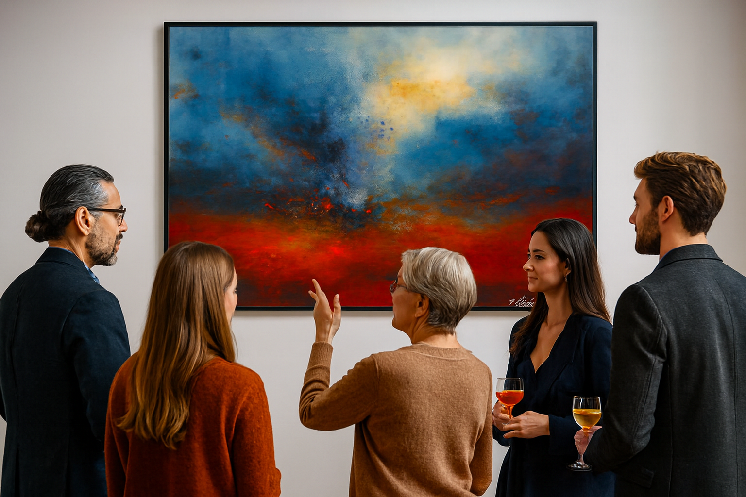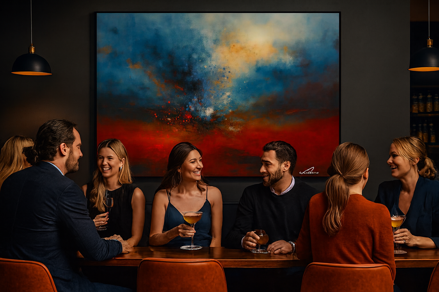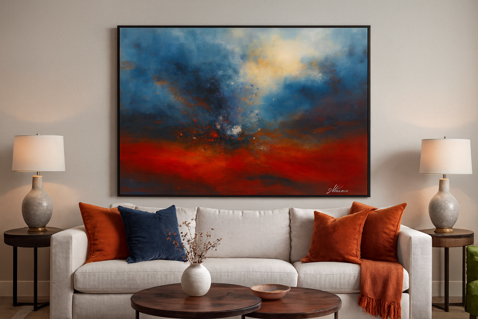 A dynamic burst of colors emerges from the center, with deep reds and vibrant blues blending into each other. The textured strokes add energy and fluidity to the scene.
