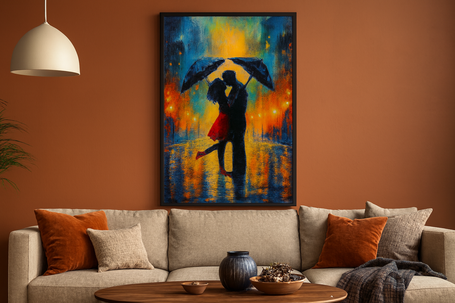 A cinematic embrace unfolds beneath twin umbrellas, as a couple kisses in the heart of a rain-slicked city. The woman’s lifted heel and crimson dress ignite the scene with passion, while the man’s silhouette anchors the moment in quiet resolve. Around them, streetlights shimmer like memory—fiery oranges and golden yellows bleeding into midnight blues. Reflections ripple across the pavement, echoing the intimacy above.