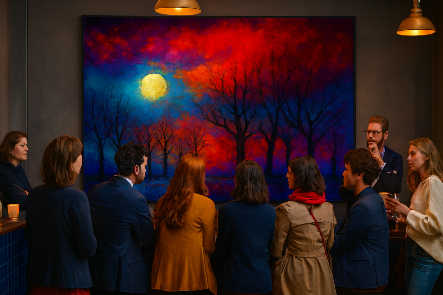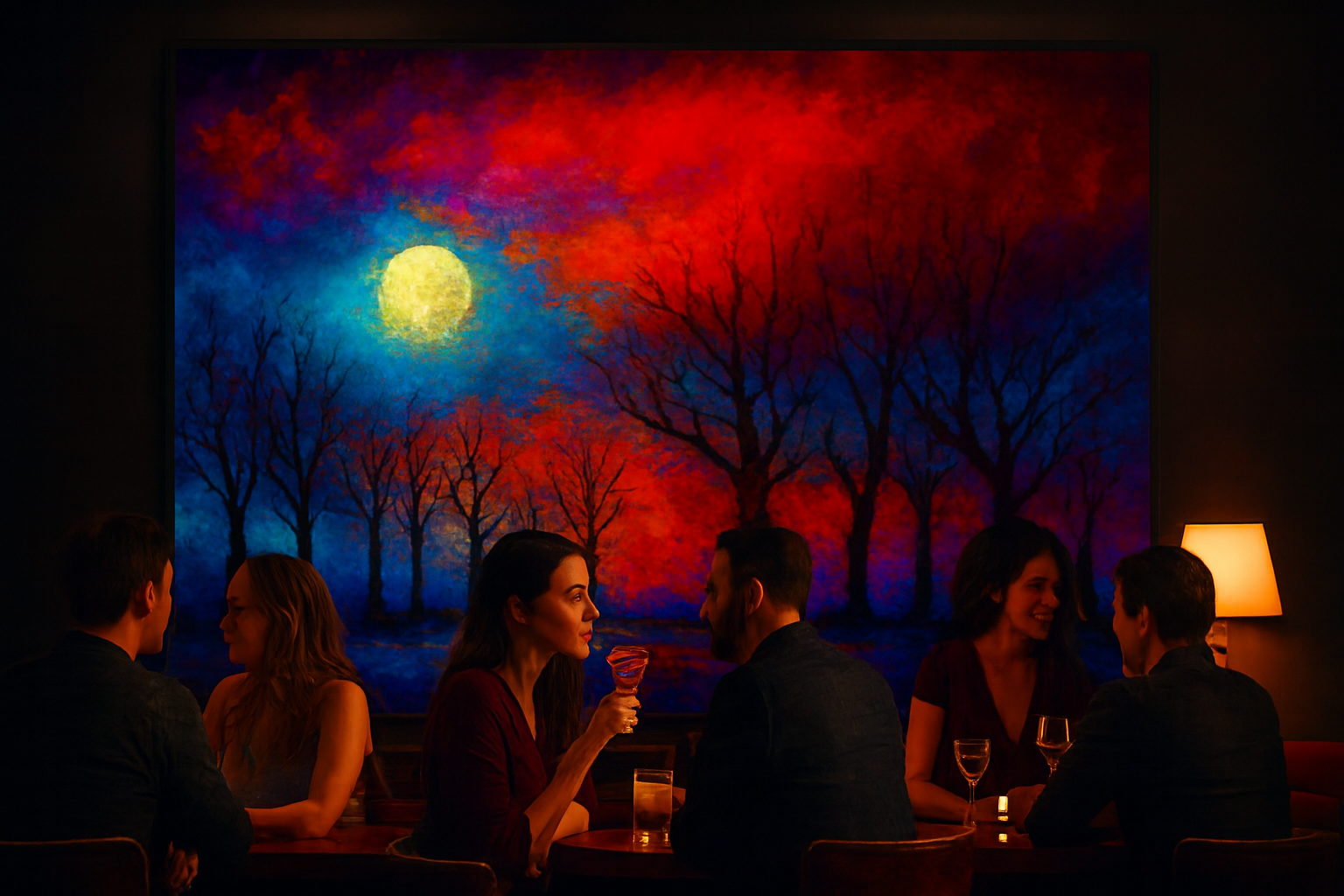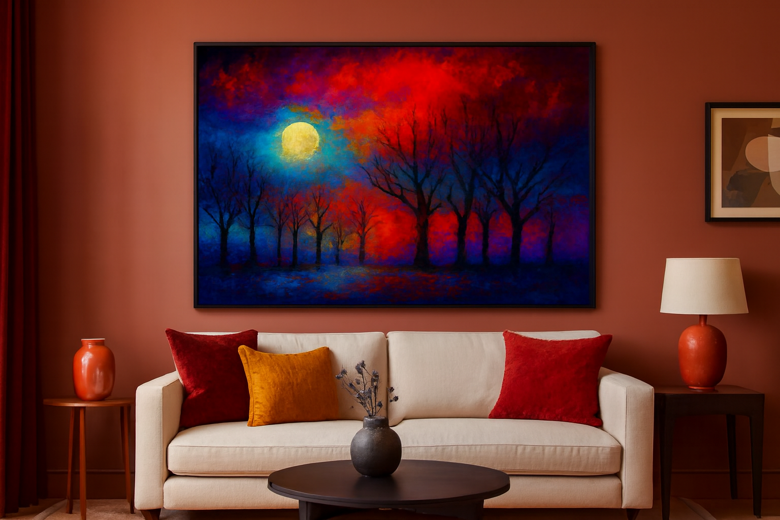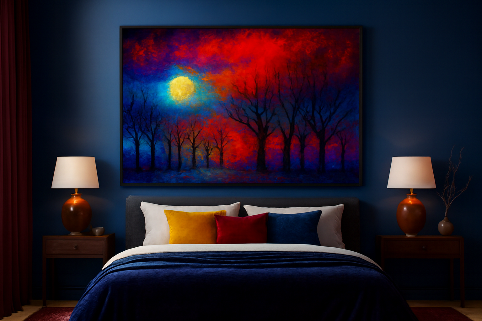A luminous moon hovers in the upper left, casting its spectral glow across a forest of leafless silhouettes. The sky ignites in a crescendo of crimson, cobalt, and violet—colors not of nature, but of memory and dream. The trees stand like sentinels, their stark forms etched against a surreal horizon, evoking both solitude and quiet reverence. The ground, awash in icy blues and purples, suggests a wintry hush beneath the firestorm above.