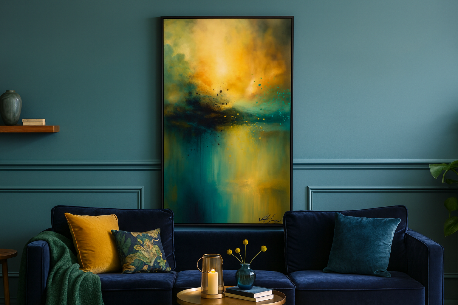 Immerse yourself in the luminous drama of Abstract Sunset Over Teal Waters, a vertical-format digital painting that captures the fleeting brilliance of golden light dissolving into deep, reflective blues. The upper canvas radiates with warm hues of amber, gold, and sunlit orange—evoking the final burst of a sunset—while the lower half transitions into tranquil tones of teal, turquoise, and midnight blue, suggesting water, depth, and introspection.