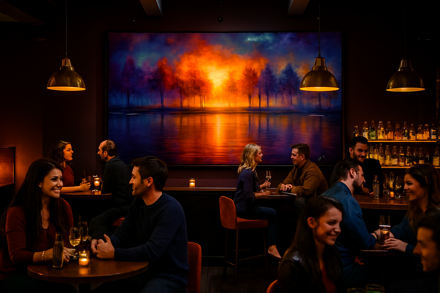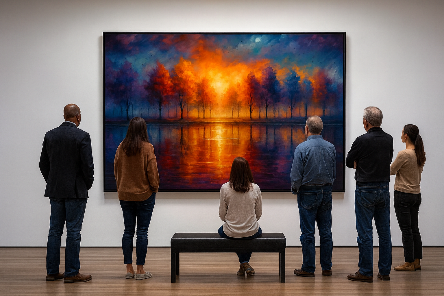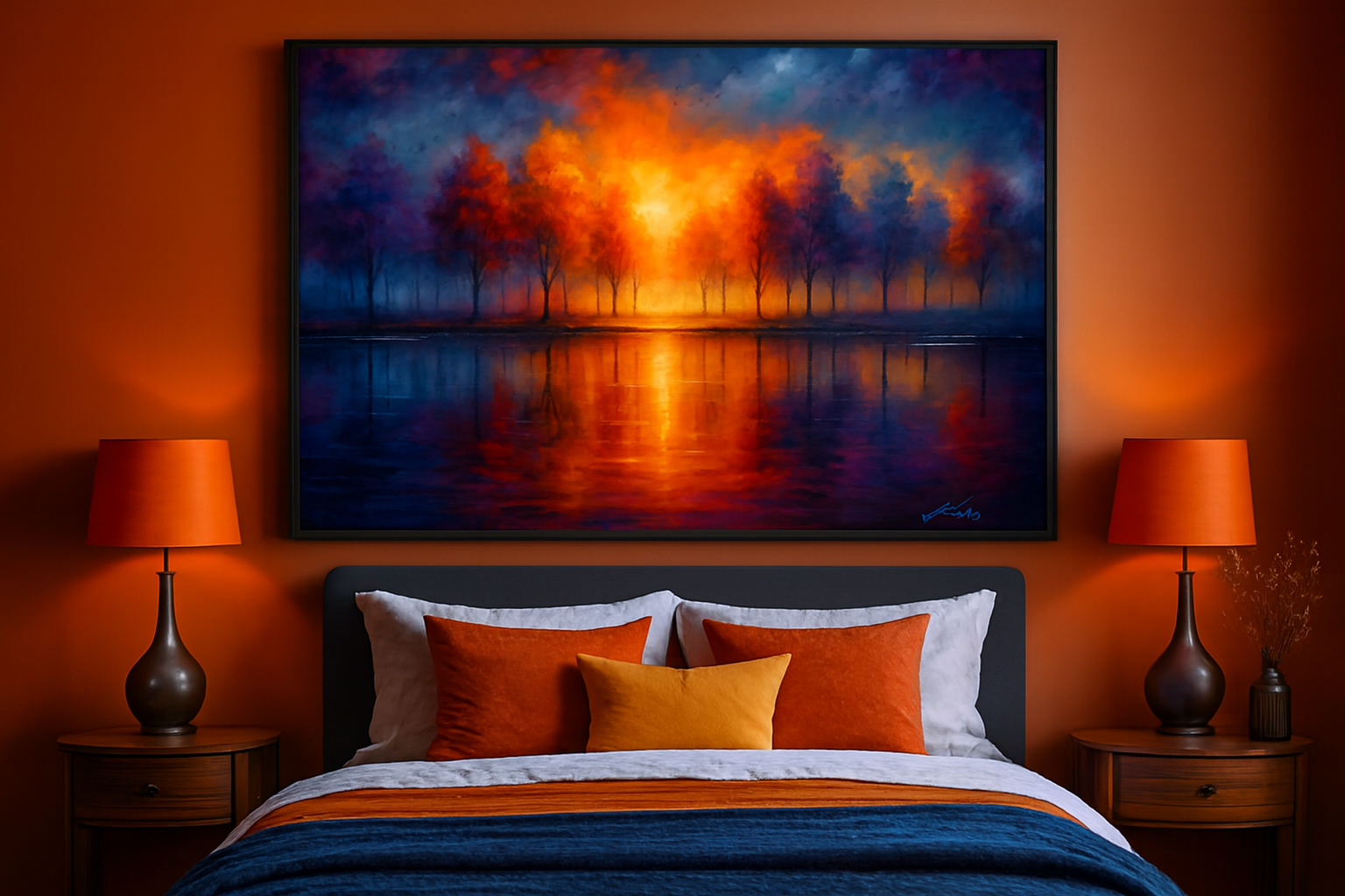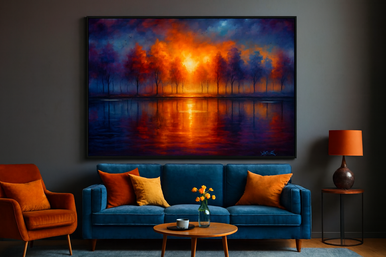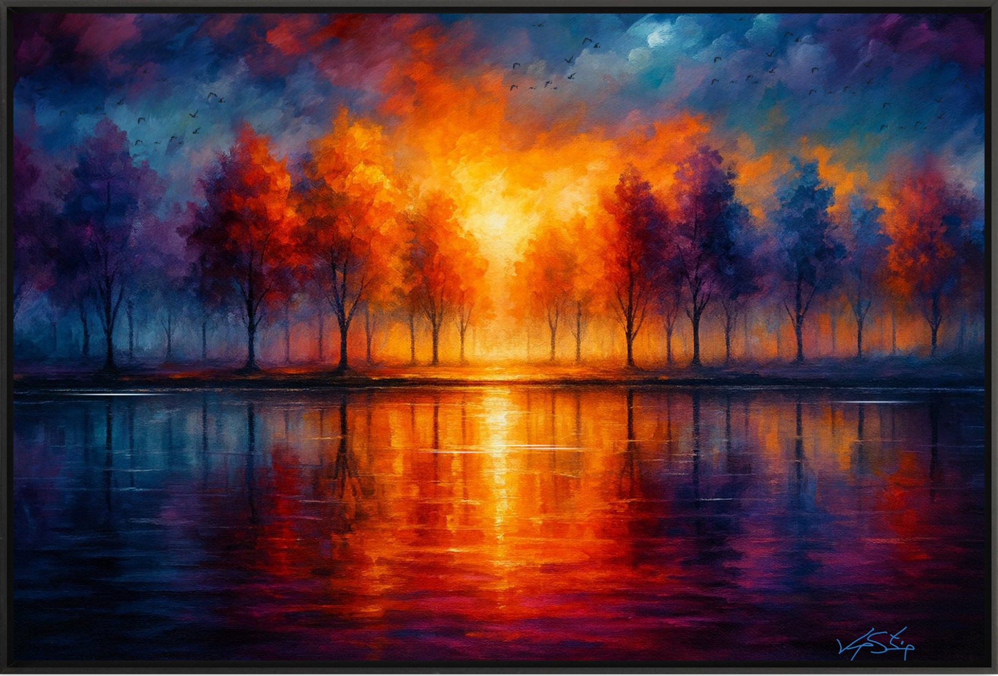 Immerse yourself in the warmth and tranquility of “Sunset Reflections Over Autumn Lake,” a vibrant landscape painting that captures the fiery glow of a forest at dusk. Silhouetted trees line the edge of a serene lake, their reflections shimmering in rich hues of orange, red, purple, and blue. This impressionistic artwork evokes the magic of sunset through bold brushstrokes and radiant color, making it a perfect centerpiece for nature lovers and art collectors seeking dramatic wall decor. Ideal for living rooms, galleries, or office spaces, this autumn sunset canvas brings peaceful energy and visual depth to any setting.