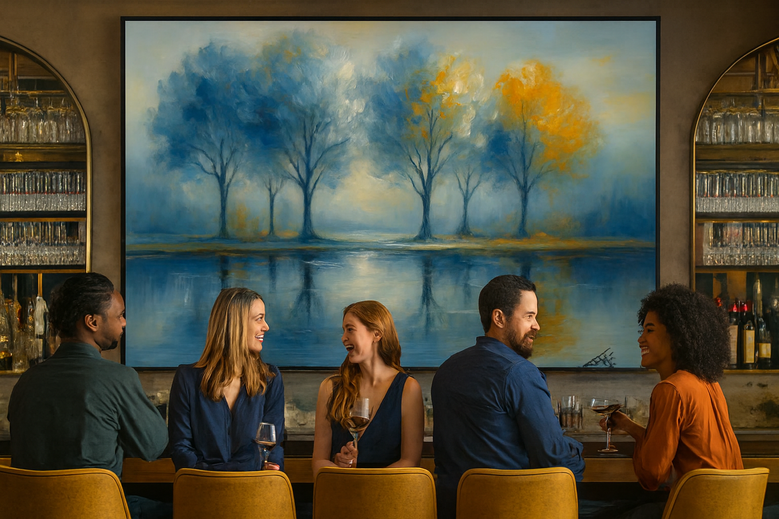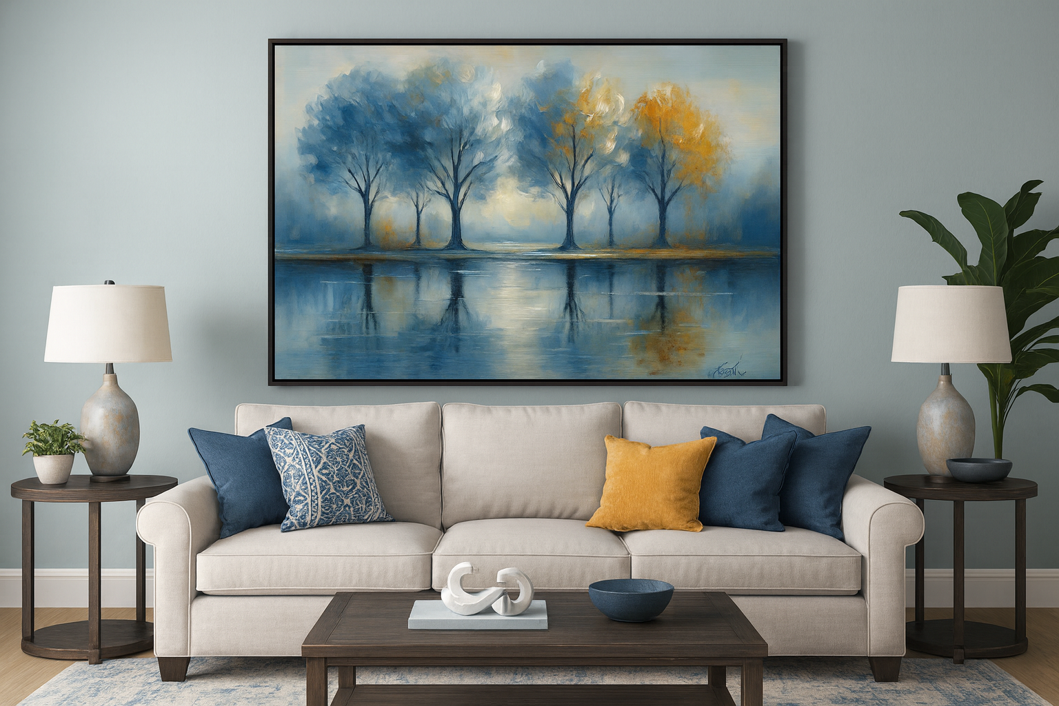 Bring serenity and elegance to your space with “Reflections of Blue and Gold,” a stunning impressionist landscape painting featuring a row of ethereal trees mirrored in calm water. This peaceful wall art blends cool blue tones with warm golden hues, creating a harmonious composition perfect for living rooms, bedrooms, offices, or gallery walls.