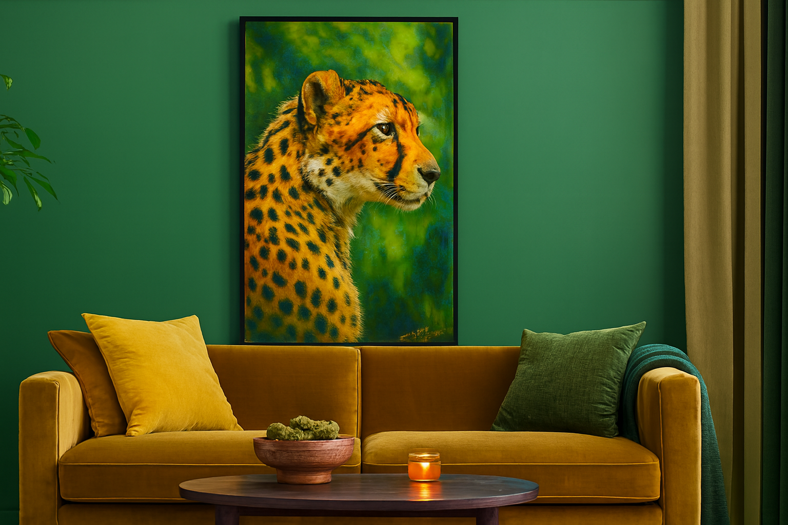 Bring the wild into your space with this striking cheetah wall decor. Featuring a vivid portrait of a cheetah in profile, this nature-inspired art piece captures the elegance, strength, and alert gaze of one of Africa’s most iconic predators. Set against a lush green backdrop, the painting blends realism with expressive brushwork, making it a perfect focal point for living rooms, bedrooms, bars, or gallery walls.