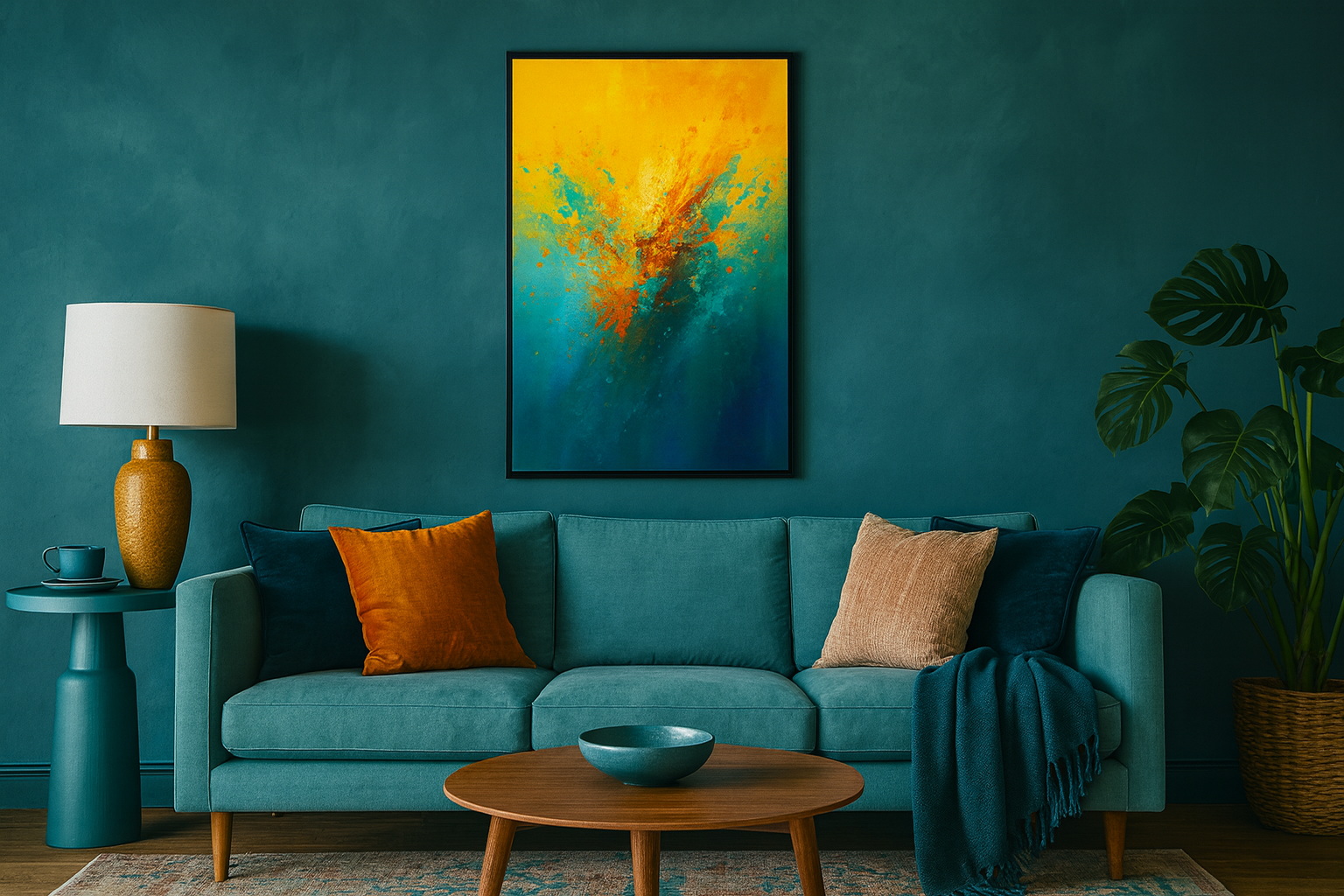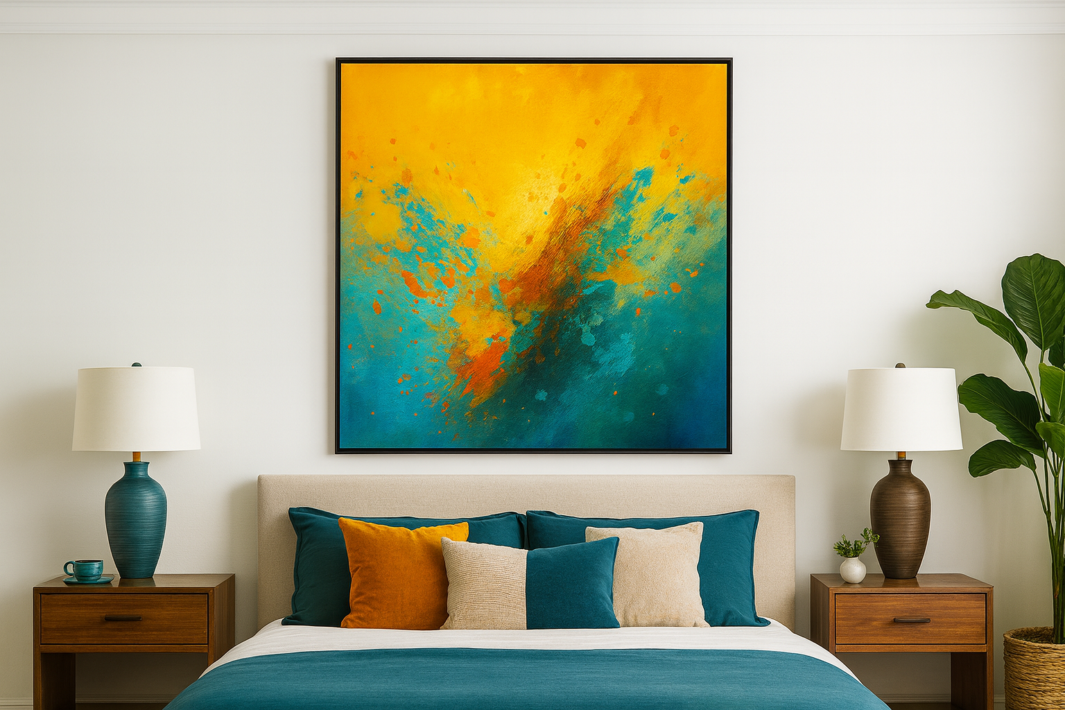 Bring bold energy and vibrant color into your space with this original abstract painting. Featuring a dynamic explosion of yellow, teal, orange, and deep blue hues, the artwork radiates movement and emotion through expressive brushstrokes and splashes of color. The composition transitions from warm golden tones at the top to rich turquoise and deep blues at the bottom, creating a striking contrast that evokes vitality, spontaneity, and depth.