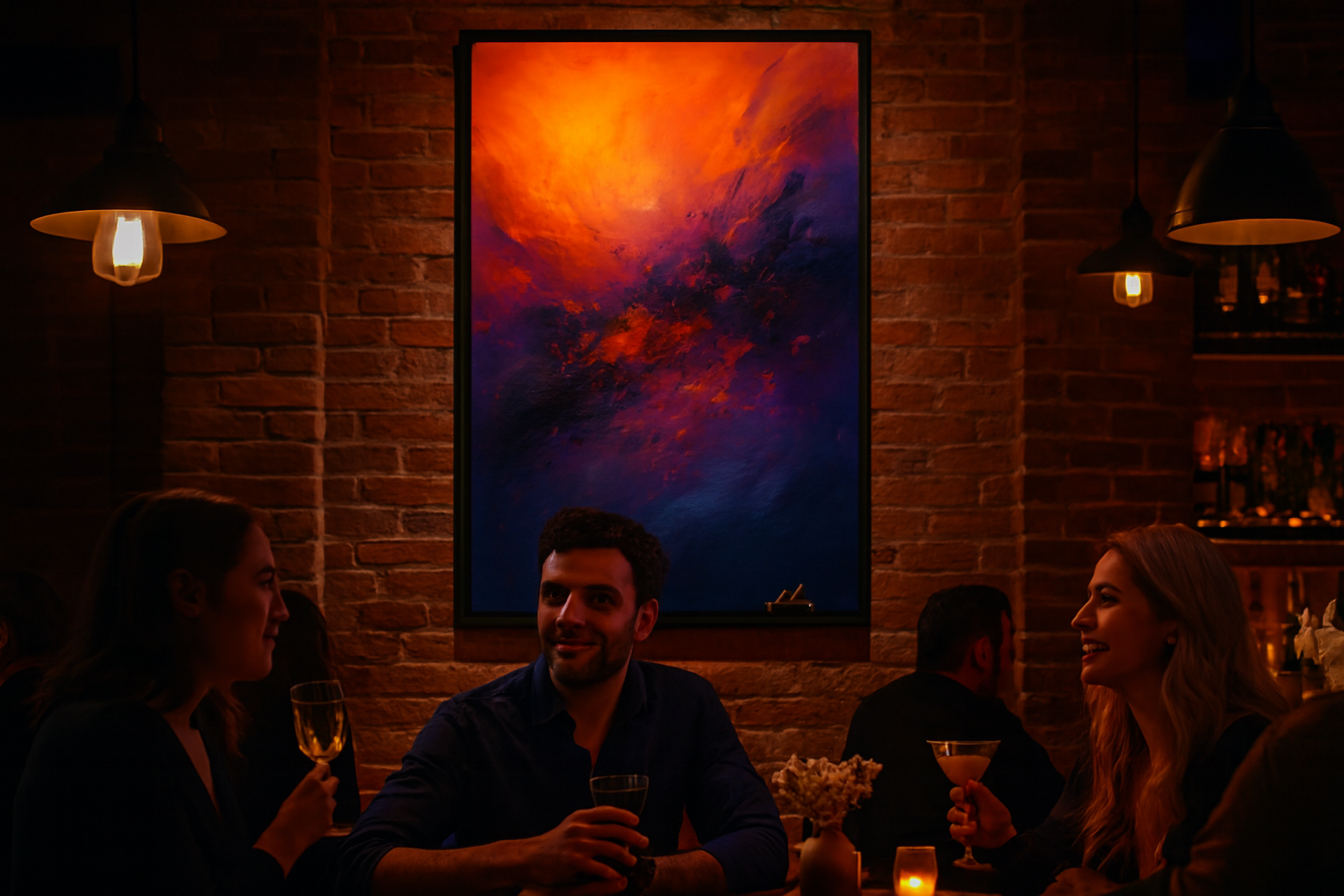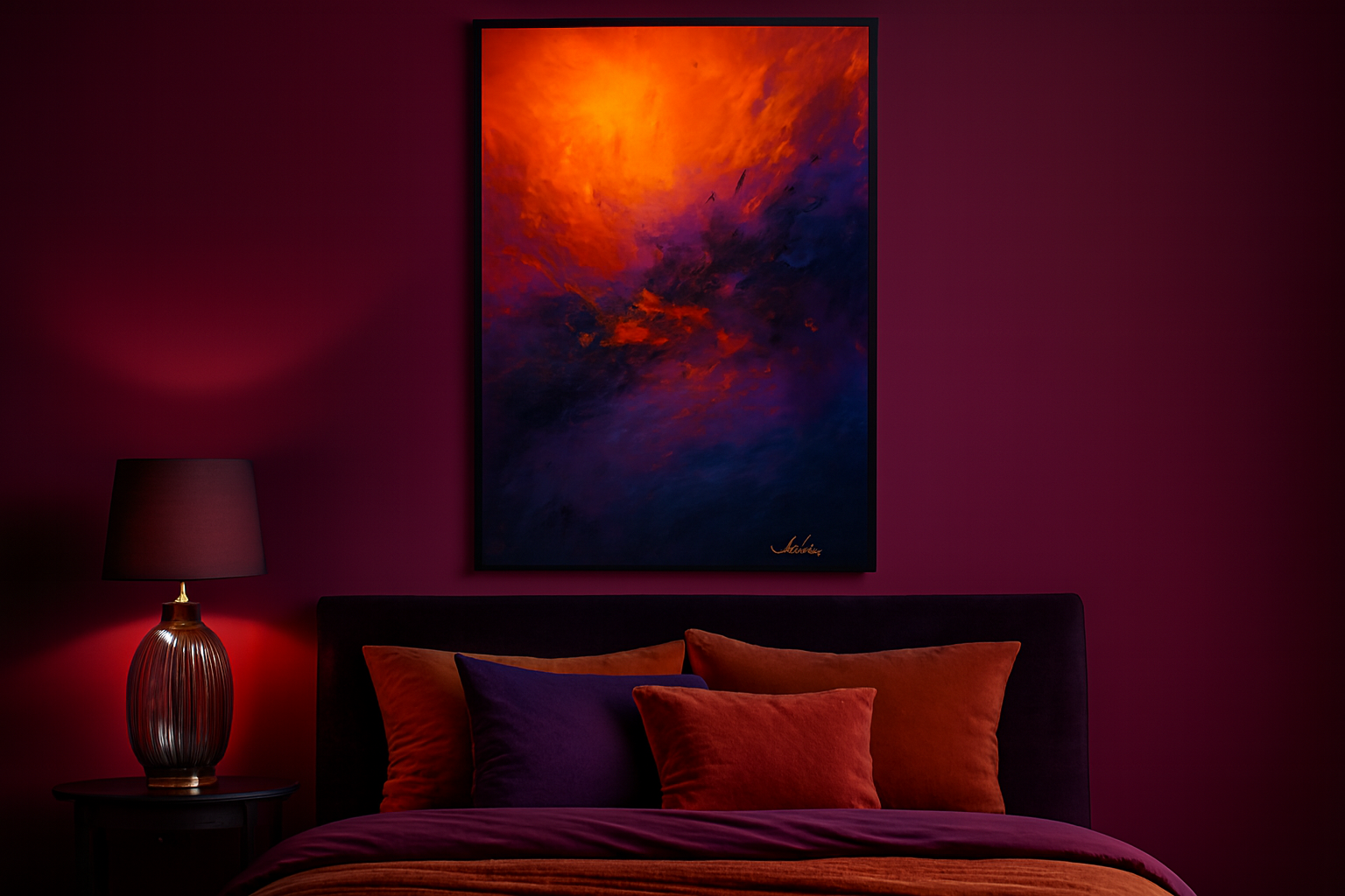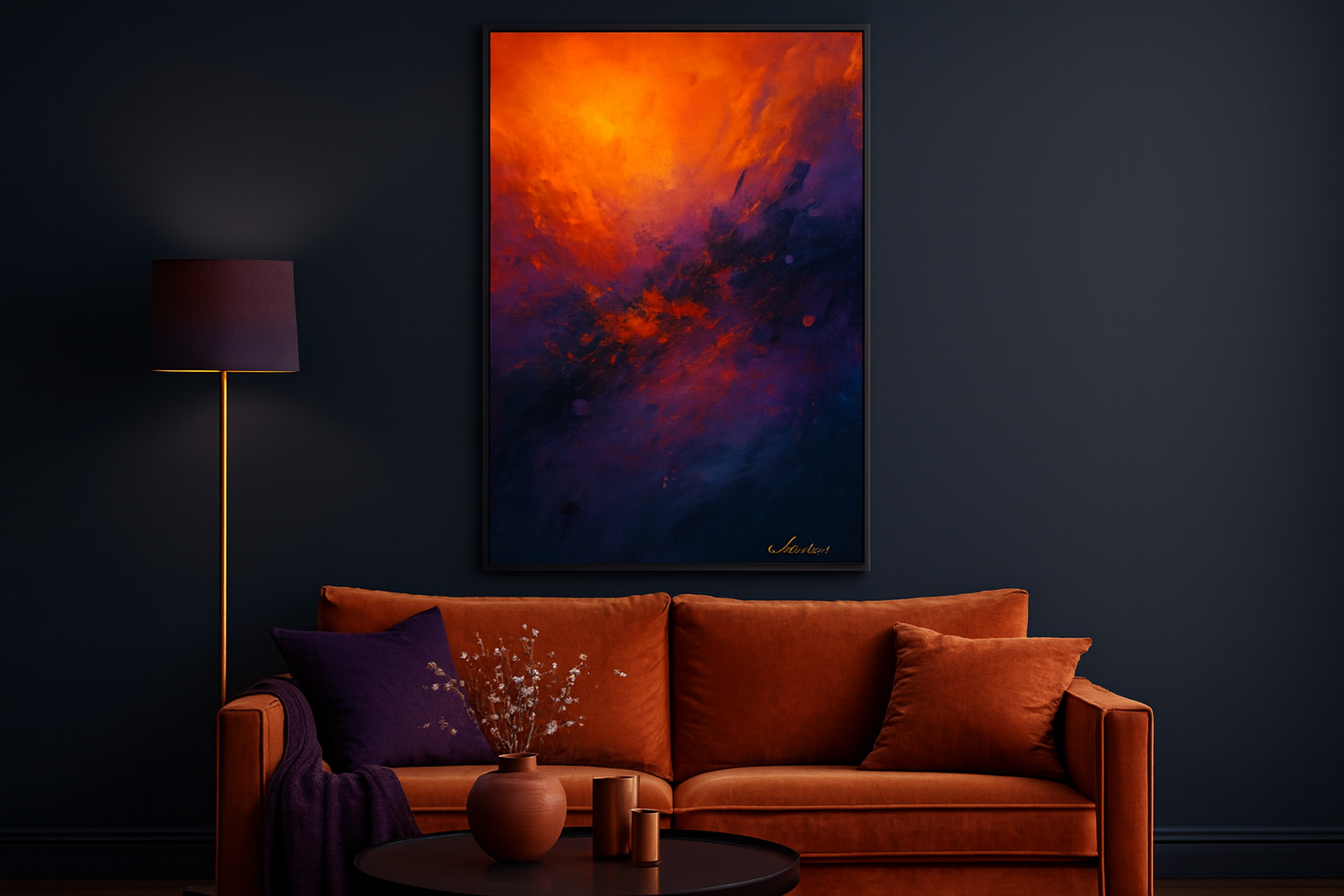 Cosmic Firestorm is a striking abstract painting that captures the explosive energy of color and motion. Fiery shades of orange and yellow ignite the canvas, blending seamlessly into deep purples and blues with bold streaks of red. This modern abstract artwork evokes the intensity of a cosmic explosion, making it a powerful centerpiece for contemporary interiors, art galleries, or private collections. Perfect for collectors seeking vibrant abstract art, Cosmic Firestorm embodies energy, movement, and dramatic contrast. This is a larger 24" X 36" art print. Printed on beautiful Coated Matte Paper.