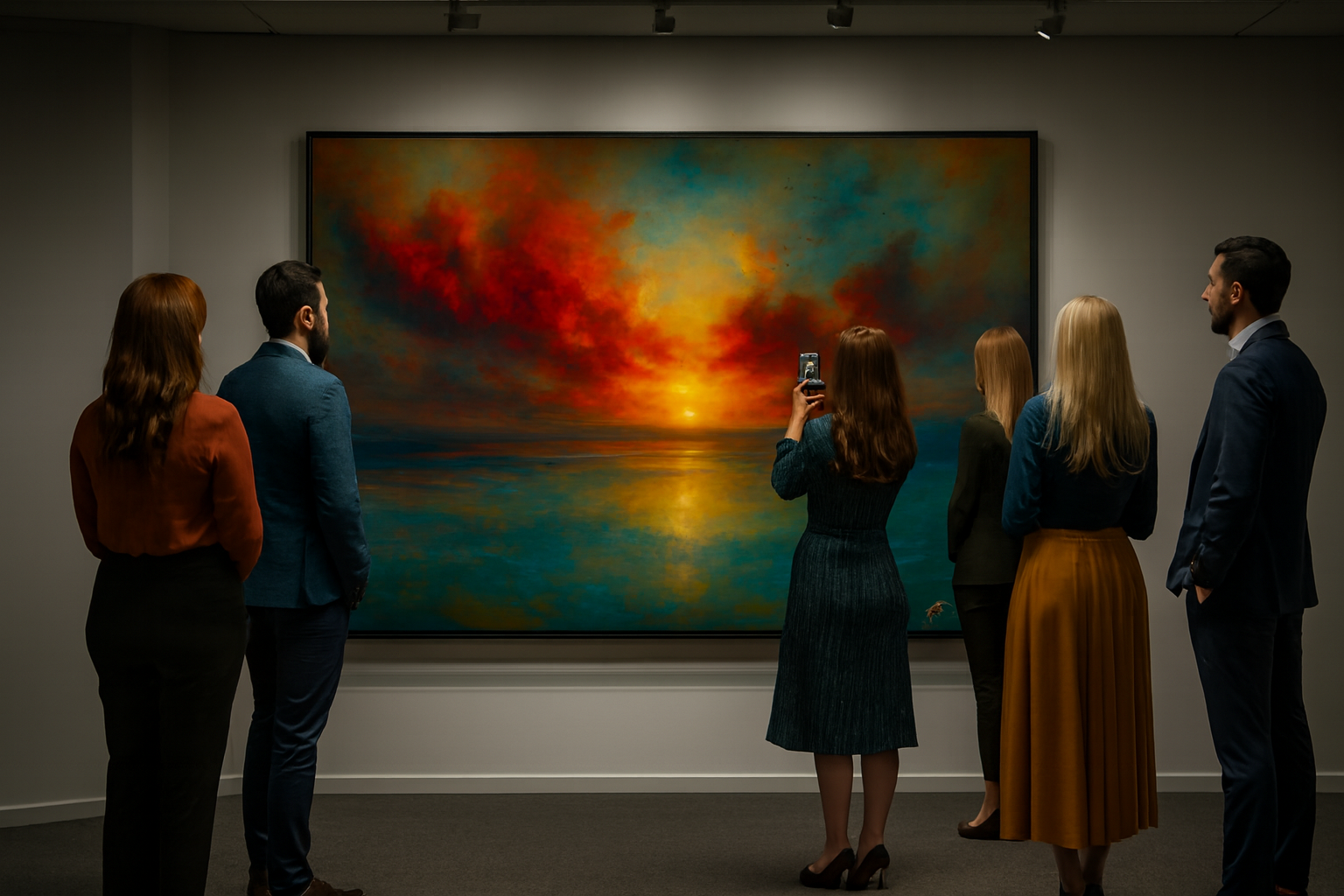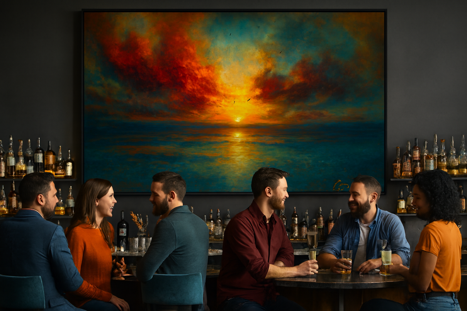 Radiant Horizon is a vibrant sunset painting capturing the golden glow of the sun over a calm ocean. Rich reds, fiery oranges, and deep blues swirl across the sky, reflecting beautifully on the water below. This dramatic seascape features textured clouds, a flock of birds in flight, and a peaceful horizon—perfect for collectors seeking bold, emotional wall art. Ideal for living rooms, bedrooms, bars, or gallery spaces, this landscape artwork adds warmth, movement, and visual impact to any setting. This is a larger 24" X 36" art print. Printed on beautiful Coated Matte Paper. It sells for only $80 and ready to frame. Shipped directly from me, free of charge.