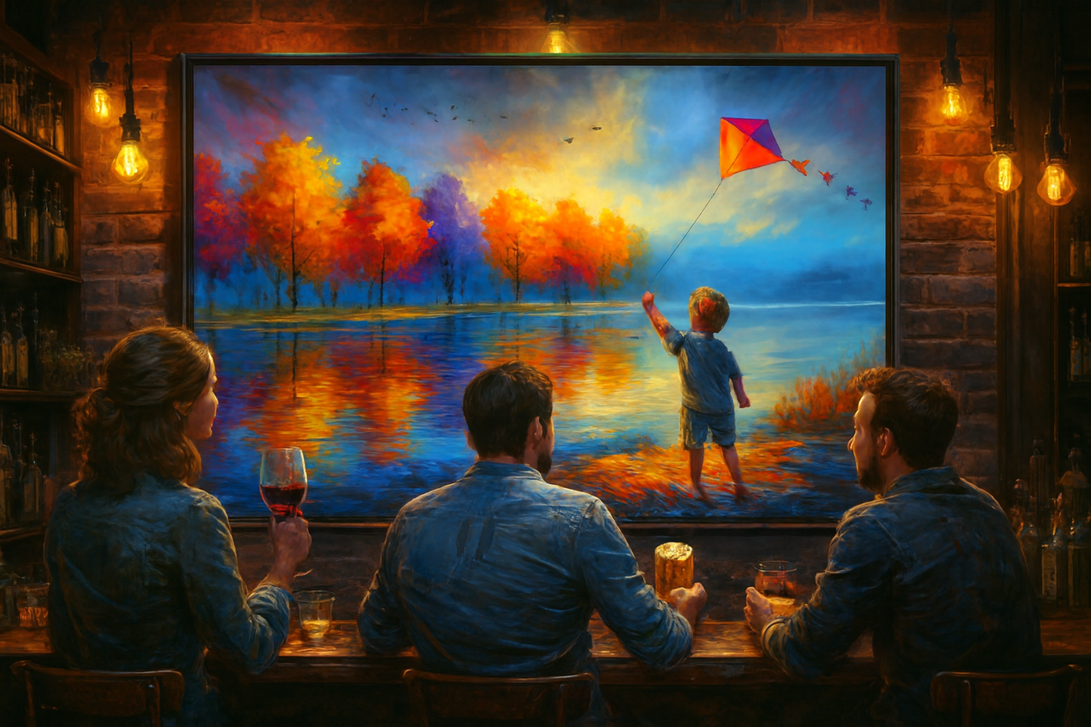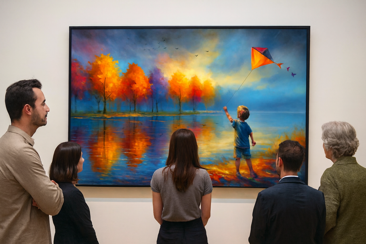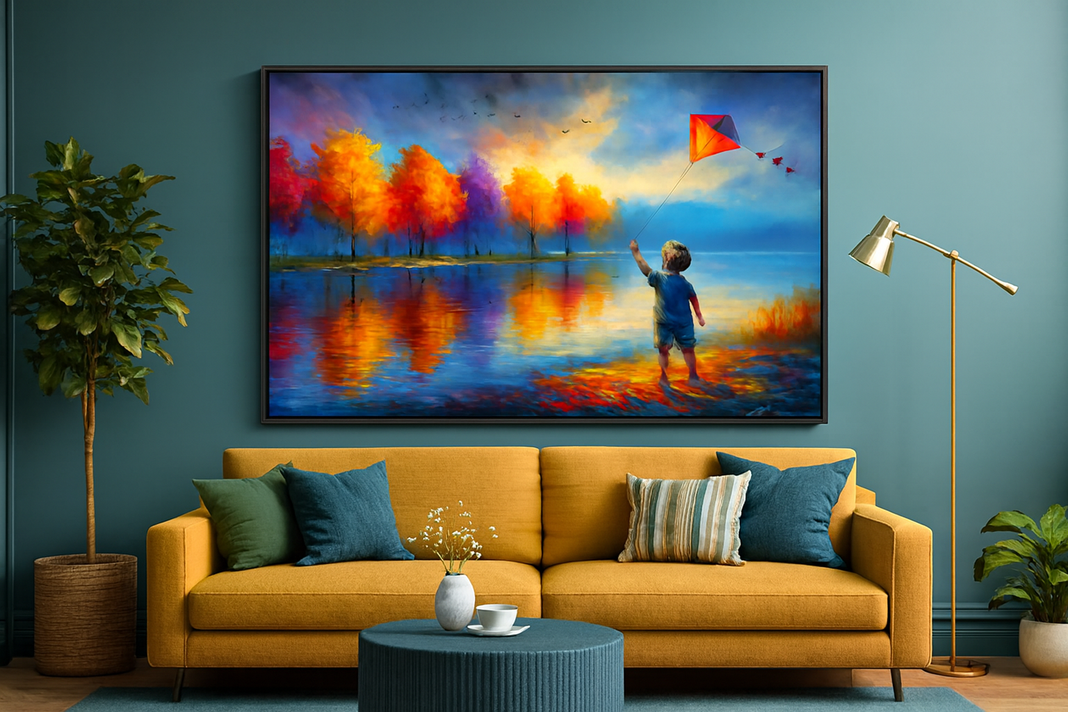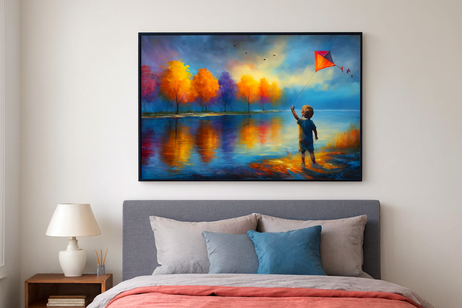 This expressive landscape painting captures a barefoot child flying a red and purple kite beside a tranquil lake at sunset. Surrounded by radiant autumn trees in fiery shades of red, orange, and gold, the scene evokes nostalgia, serenity, and the joy of childhood. Bold brushstrokes and mirrored reflections in the water create a dreamlike atmosphere, while birds soaring overhead add motion and life.