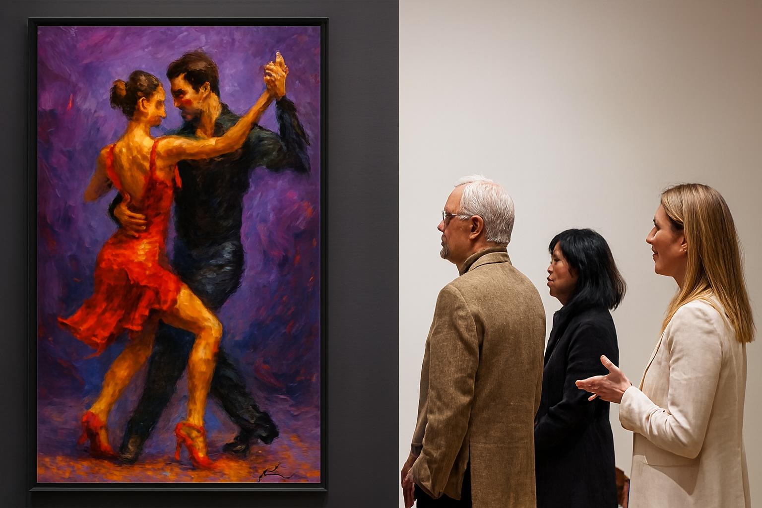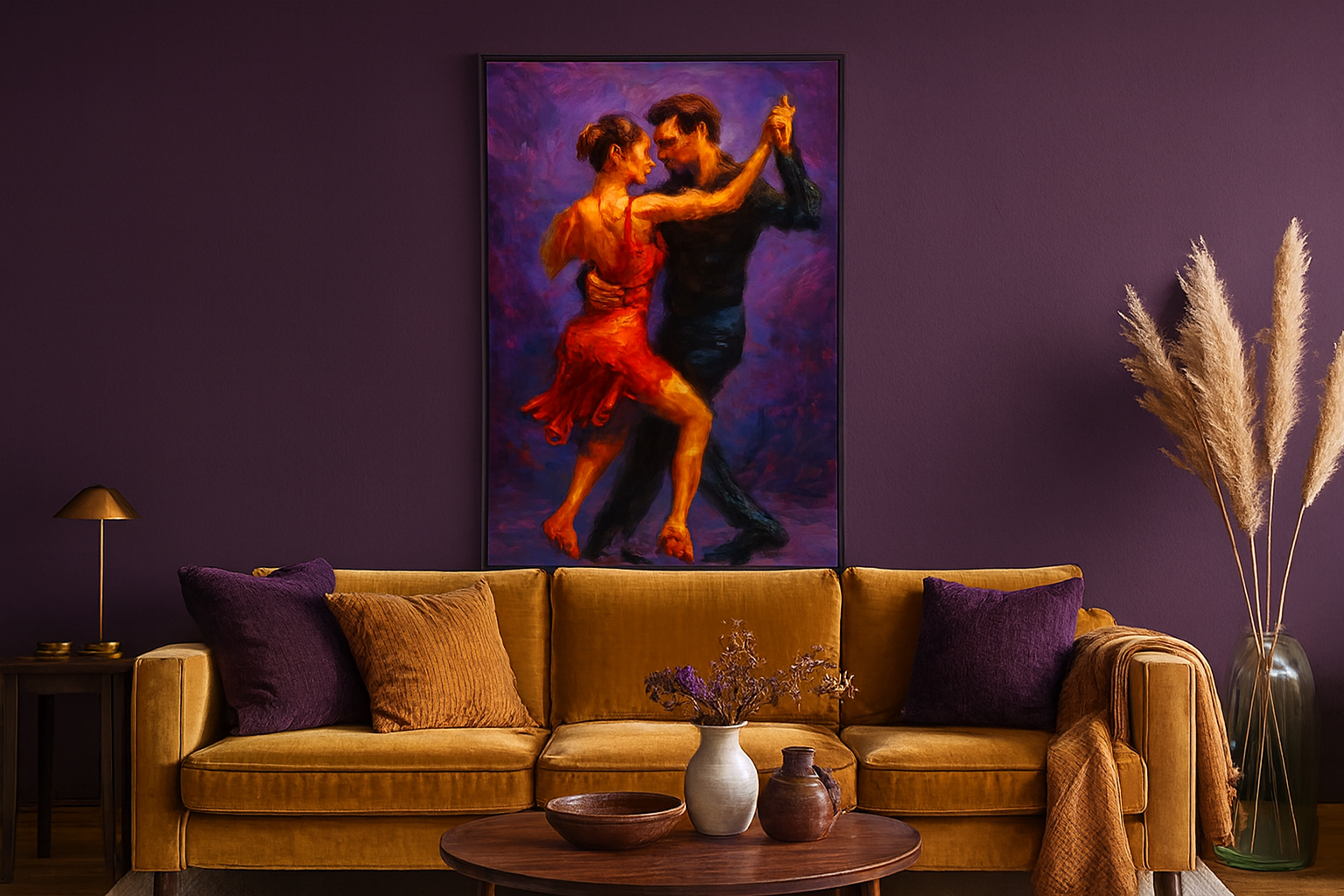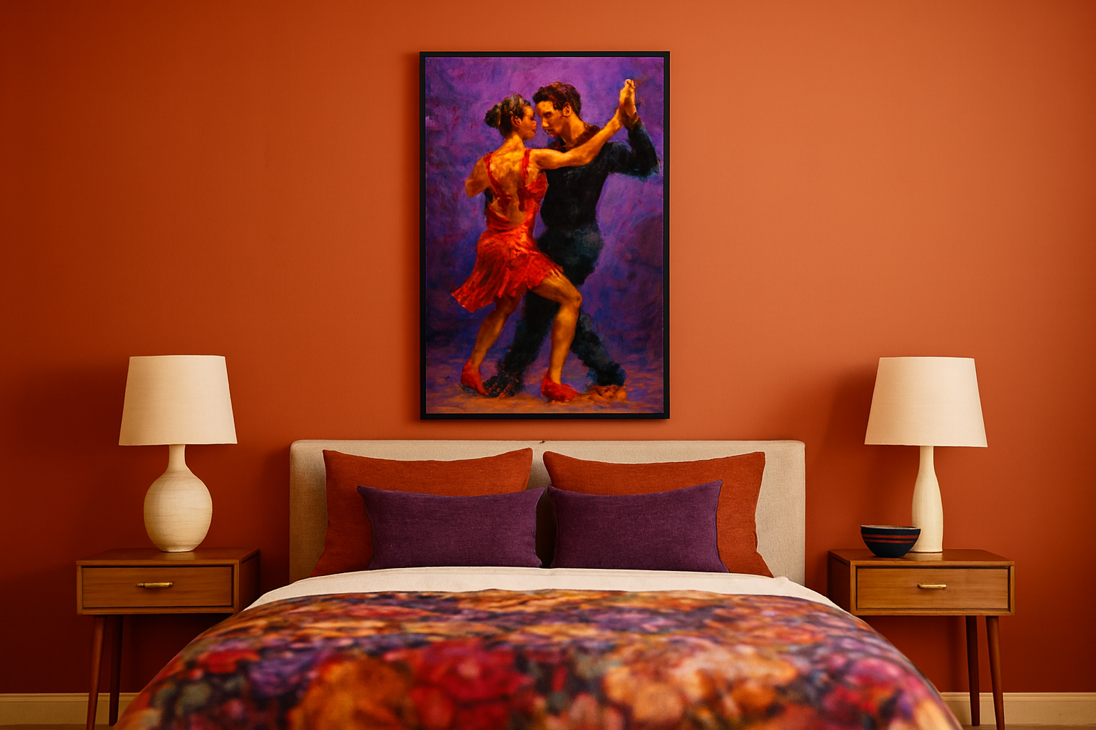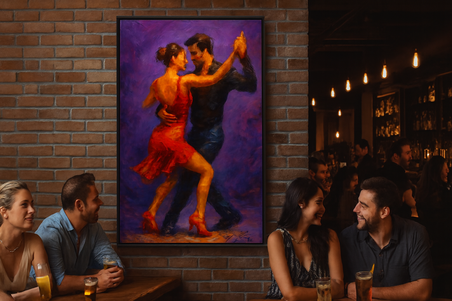 Experience the intensity of movement and emotion in this expressive dance painting featuring a couple locked in a passionate tango. The woman’s vibrant red dress and poised stance contrast against a swirling backdrop of purples and blues, while the man’s dark attire anchors the composition in dramatic tension. Bold brushstrokes and dynamic posture capture the rhythm and intimacy of the moment, making this artwork ideal for collectors of romantic figurative art, dance-themed paintings, or Latin-inspired decor. Perfect for gallery walls, living spaces, or art blogs seeking evocative visual storytelling.