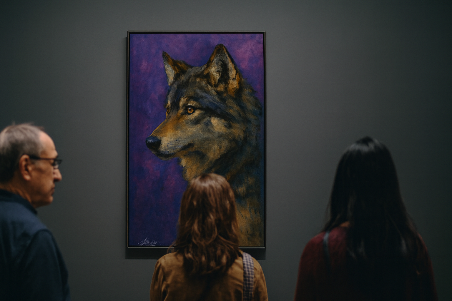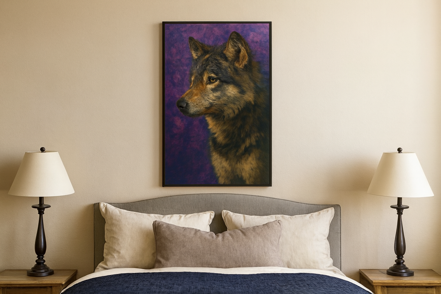 Capture the wild spirit of nature with this striking portrait of a grey wolf, rendered in a realistic painterly style. This original artwork features textured brushstrokes and a rich twilight-inspired background of purples and blues, highlighting the wolf’s alert gaze and powerful presence. Perfect for collectors of wildlife art, nature lovers, and fans of expressive animal paintings, this piece adds depth and drama to any space. Ideal for gallery walls, rustic interiors, or modern homes seeking a bold focal point. Available as a fine art print or canvas reproduction.