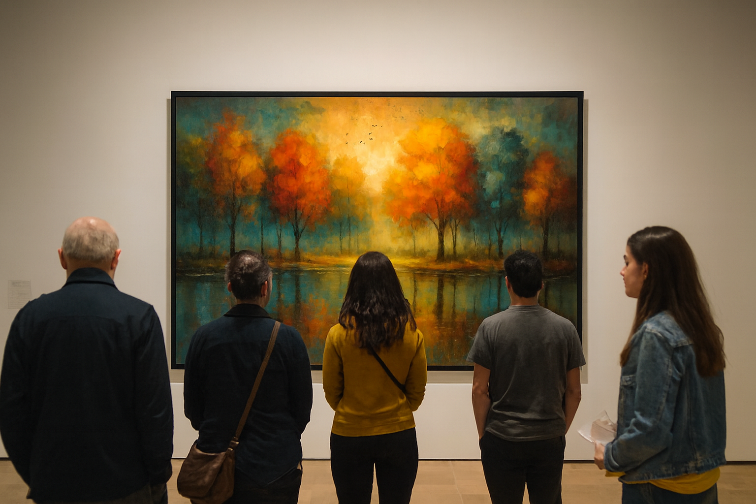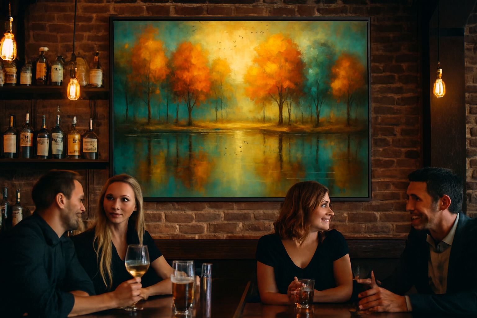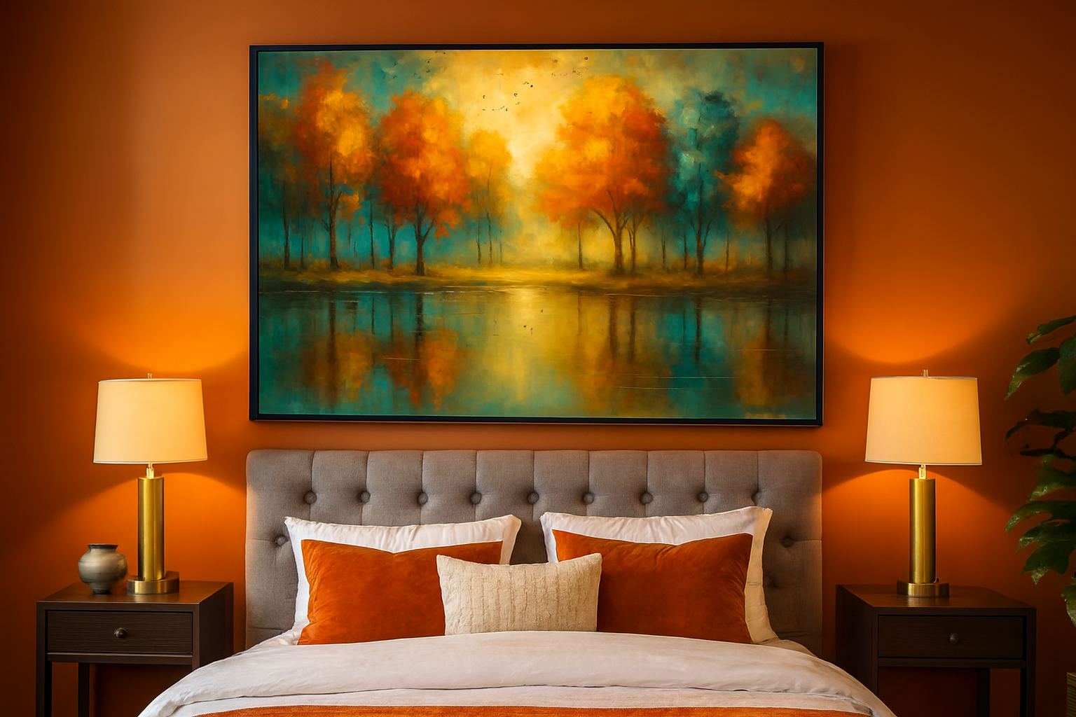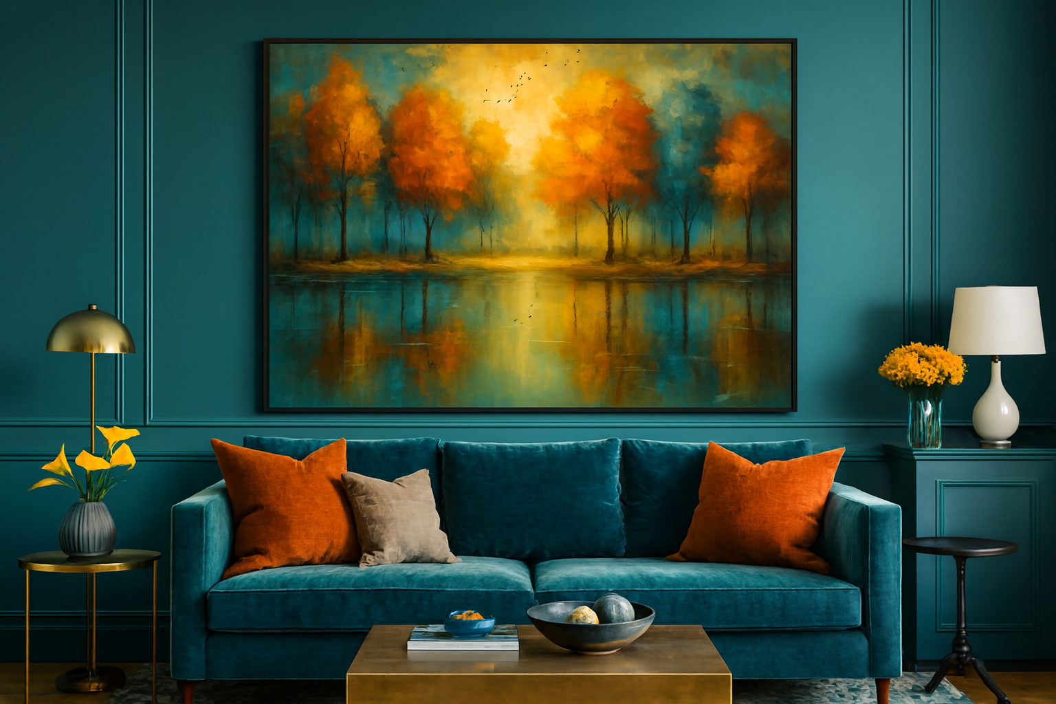 Immerse yourself in the serene beauty of Autumn Radiance: Teal Reflections and Golden Light, a vibrant impressionist landscape painting that captures the magic of fall. Brilliant orange, yellow, and teal trees line the water’s edge, their colors mirrored in the calm reflections below. A warm golden sunset glow illuminates the scene, while graceful birds in flight add movement and life to the tranquil atmosphere. Expressive brushstrokes and textured layers bring depth and emotion, making this artwork a perfect centerpiece for those who love autumn nature art, impressionist landscapes, and colorful seasonal décor. Ideal for collectors and home décor enthusiasts seeking a piece that blends peaceful energy with striking color harmony.