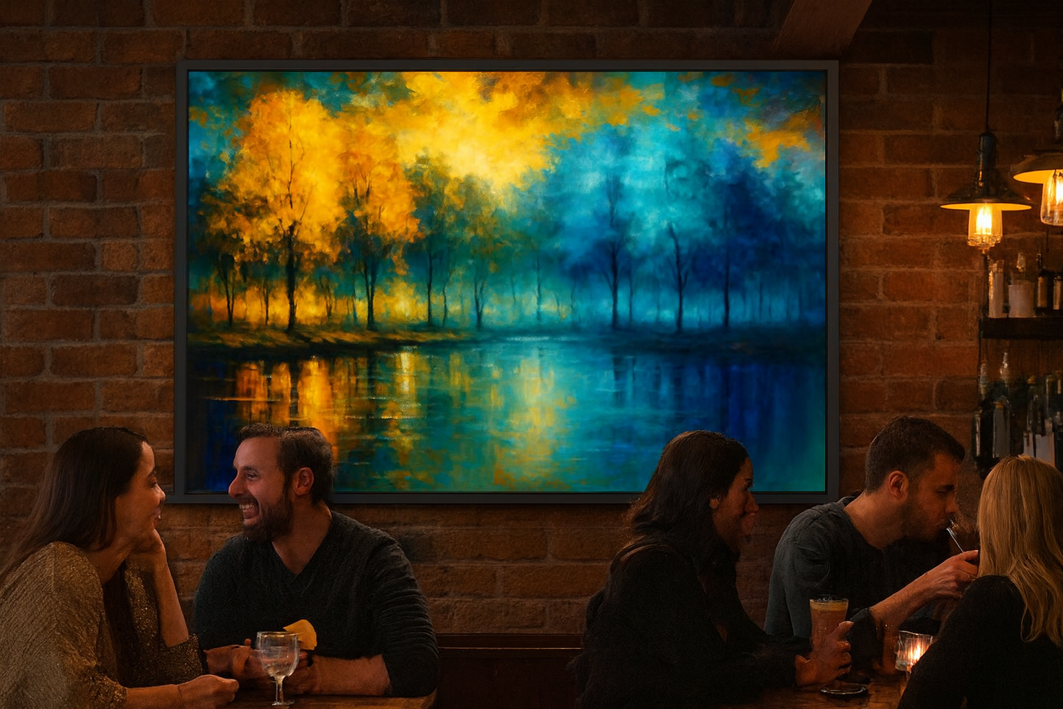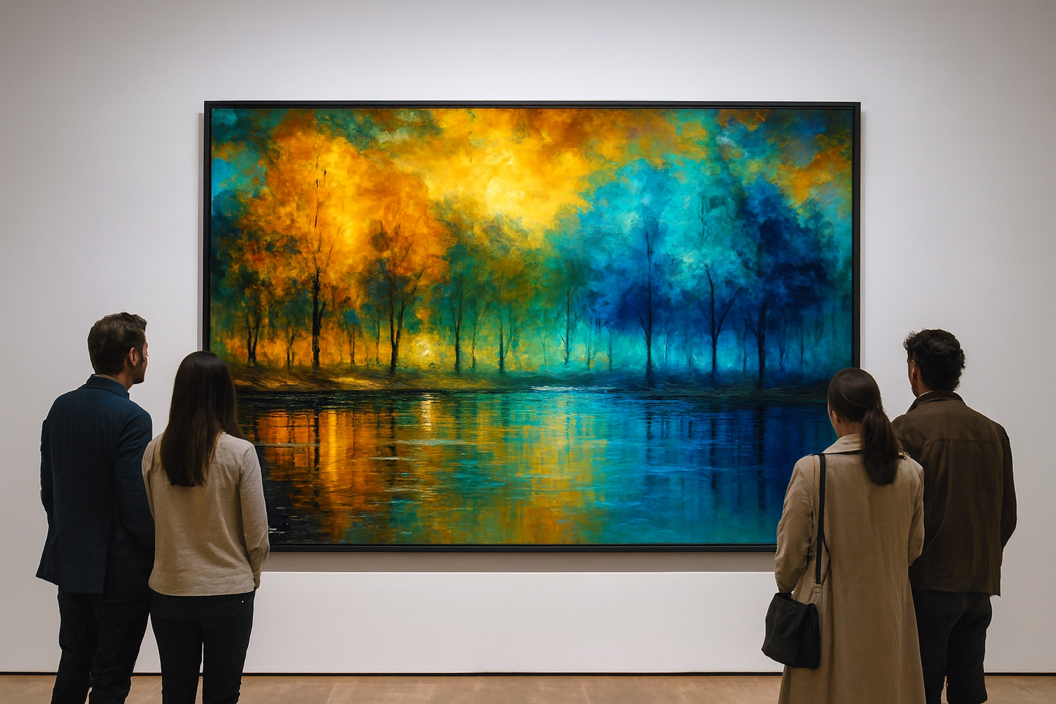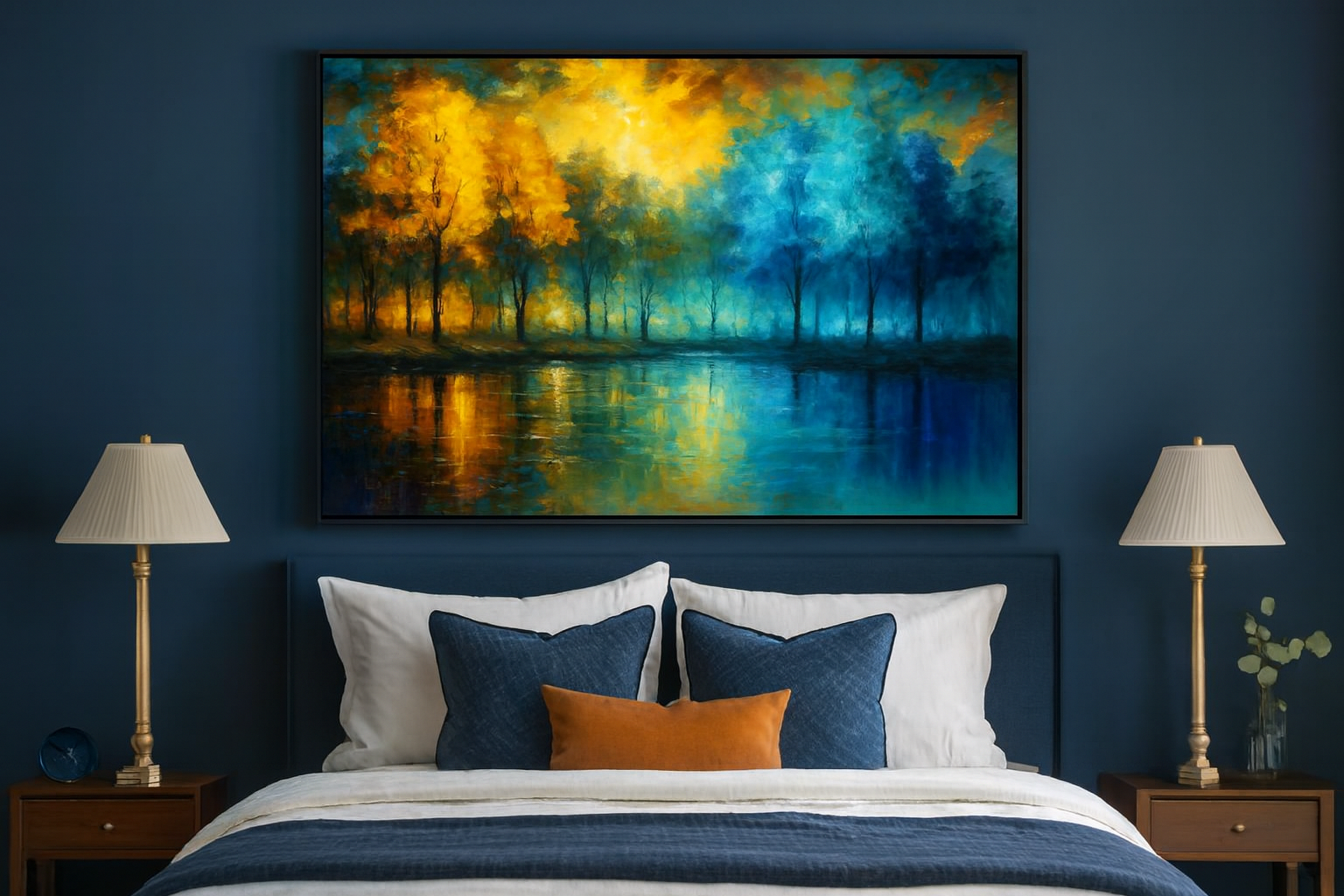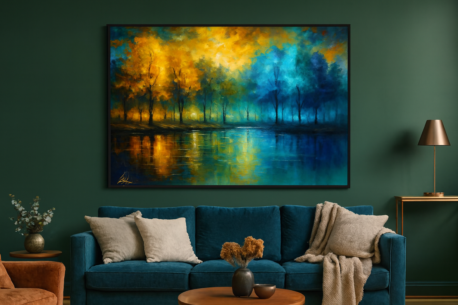 Immerse yourself in the captivating duality of nature with Seasonal Reflections: Autumn Gold Meets Winter Blue Forest. This vibrant landscape painting showcases a dramatic transition from fiery autumn foliage to serene winter blues, mirrored perfectly in a tranquil body of water. Bold brushstrokes and rich color contrast evoke emotion and depth, making it a standout piece for collectors of seasonal, abstract, or nature-inspired art. Ideal for living rooms, offices, or gallery walls, this artwork blends warmth and coolness in a single, harmonious composition. Perfect for fans of impressionist forest scenes, colorful reflections, and seasonal transitions.