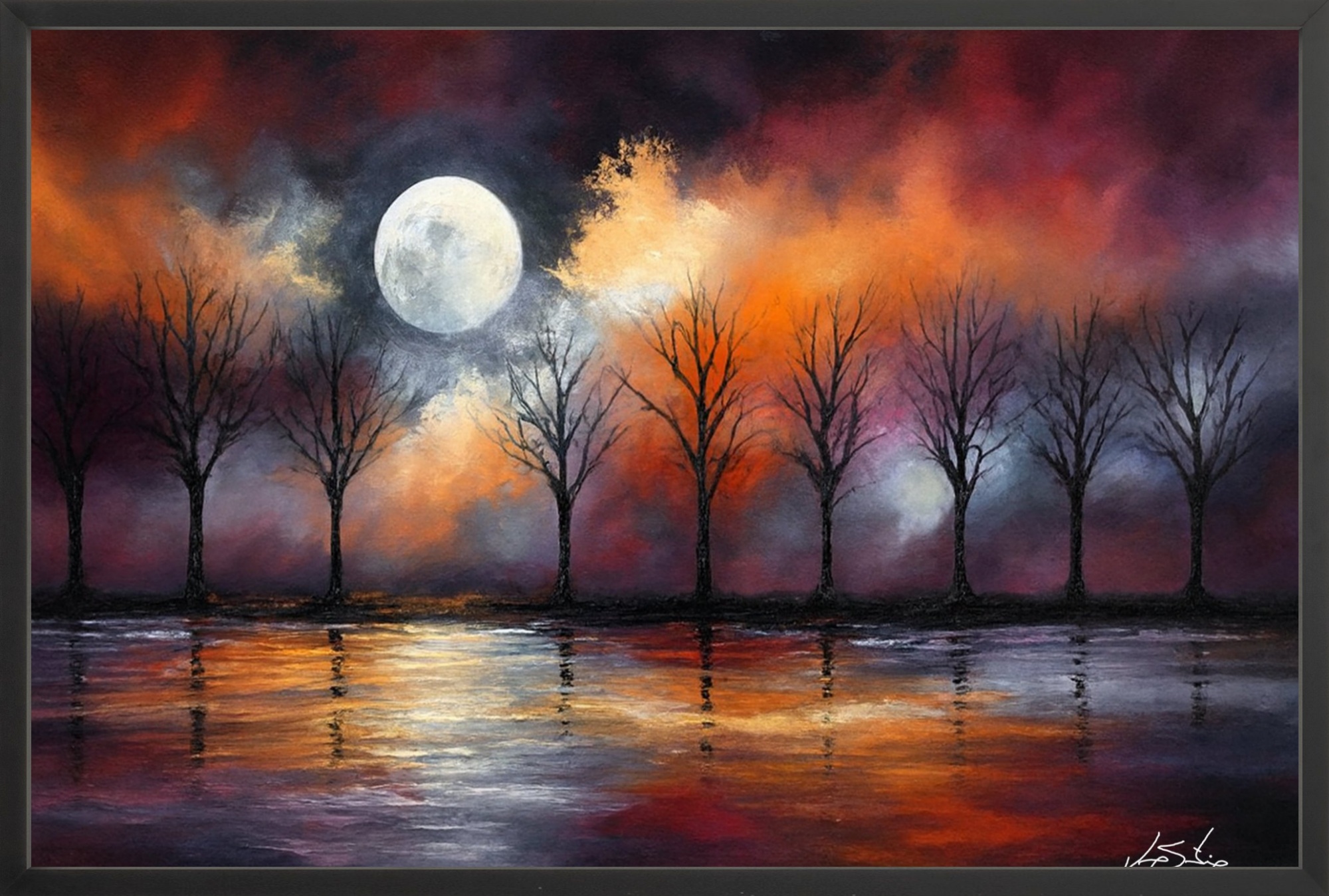 “Celestial Echoes: Bare Trees Under Fiery Moonrise” is a dramatic moonlit landscape painting featuring a glowing full moon rising behind a row of silhouetted bare trees. Vivid streaks of fiery orange, deep purple, and midnight blue sweep across the sky, creating a powerful contrast against the dark tree line. Below, the calm water reflects the luminous moon and vibrant sky, adding depth, symmetry, and emotional resonance to the scene.