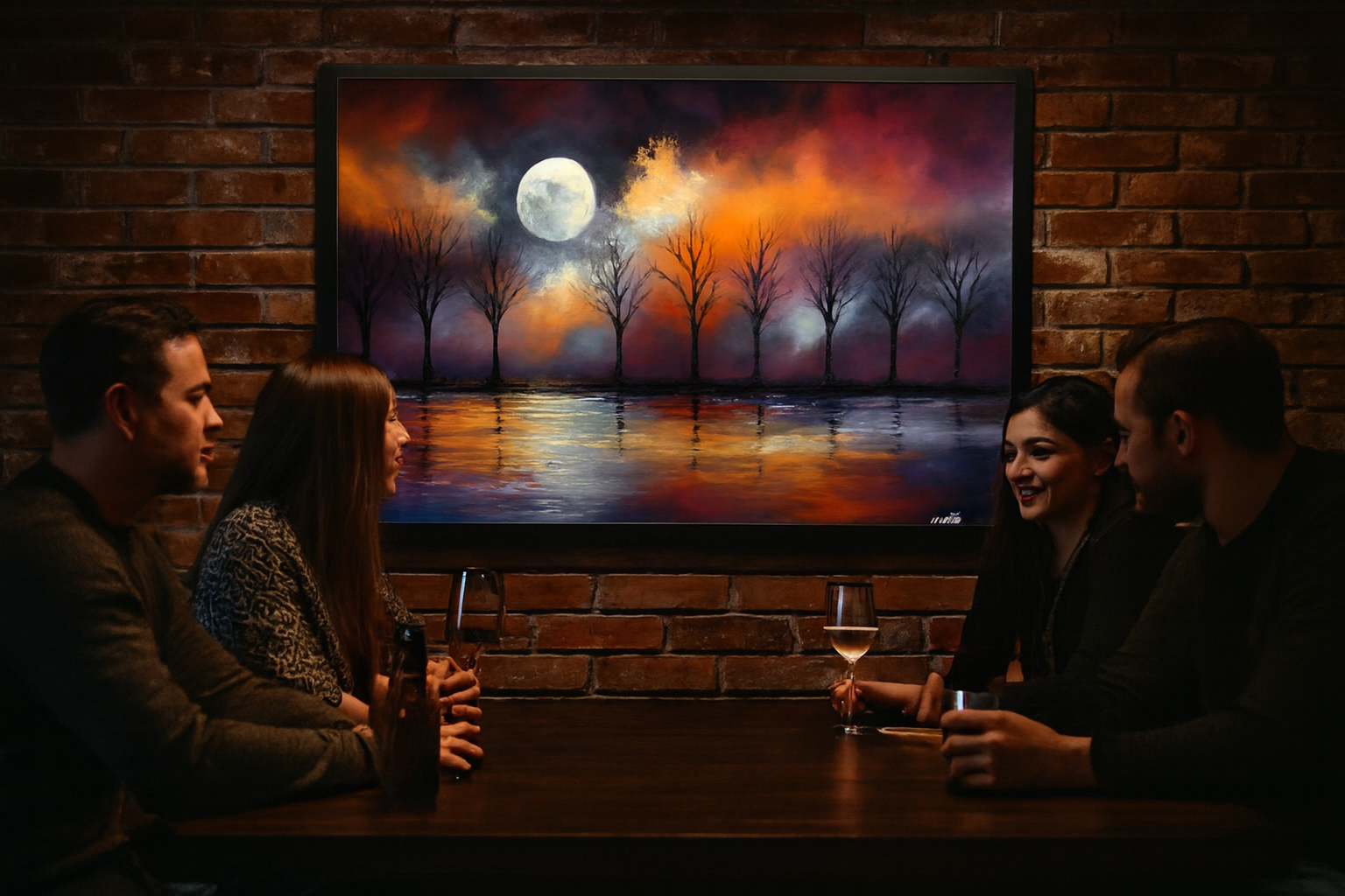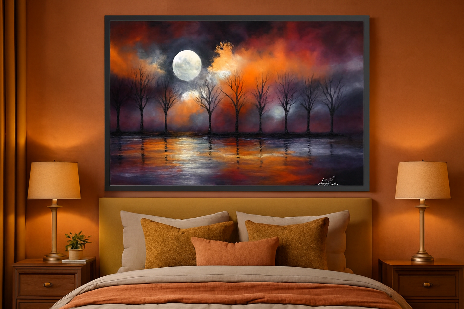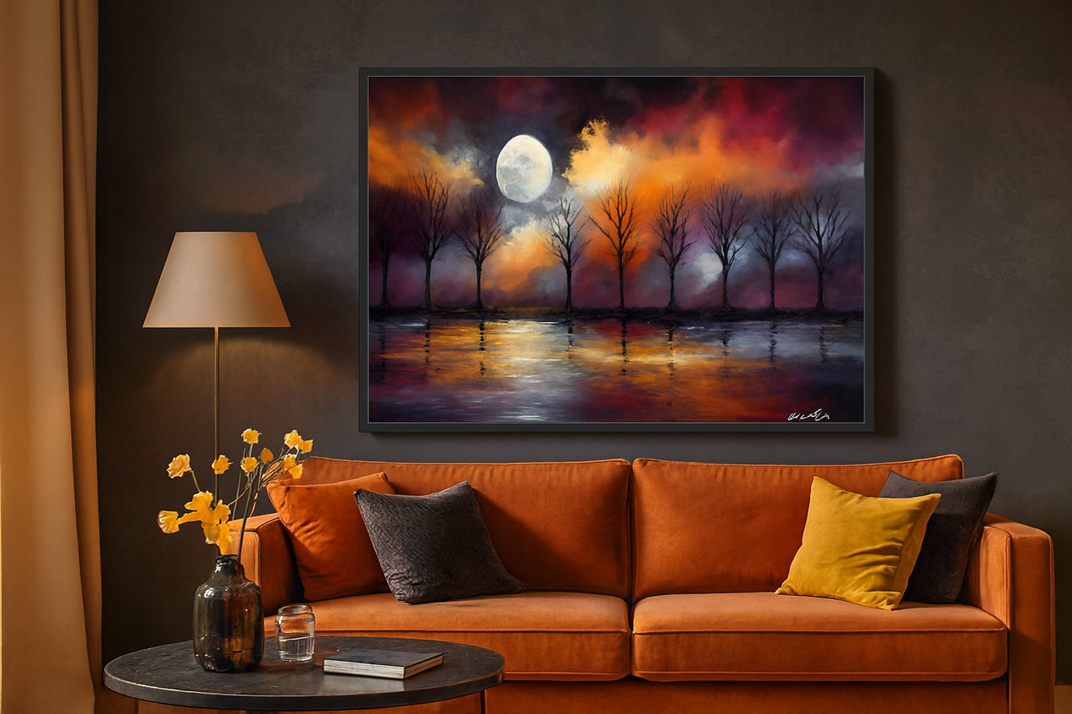 This artwork blends surreal atmosphere, cosmic color palettes, and tranquil natural elements, making it a striking centerpiece for living rooms, bedrooms, creative studios, and modern gallery walls. Perfect for collectors who love moon art, tree silhouettes, fantasy landscapes, and bold, colorful nature paintings.