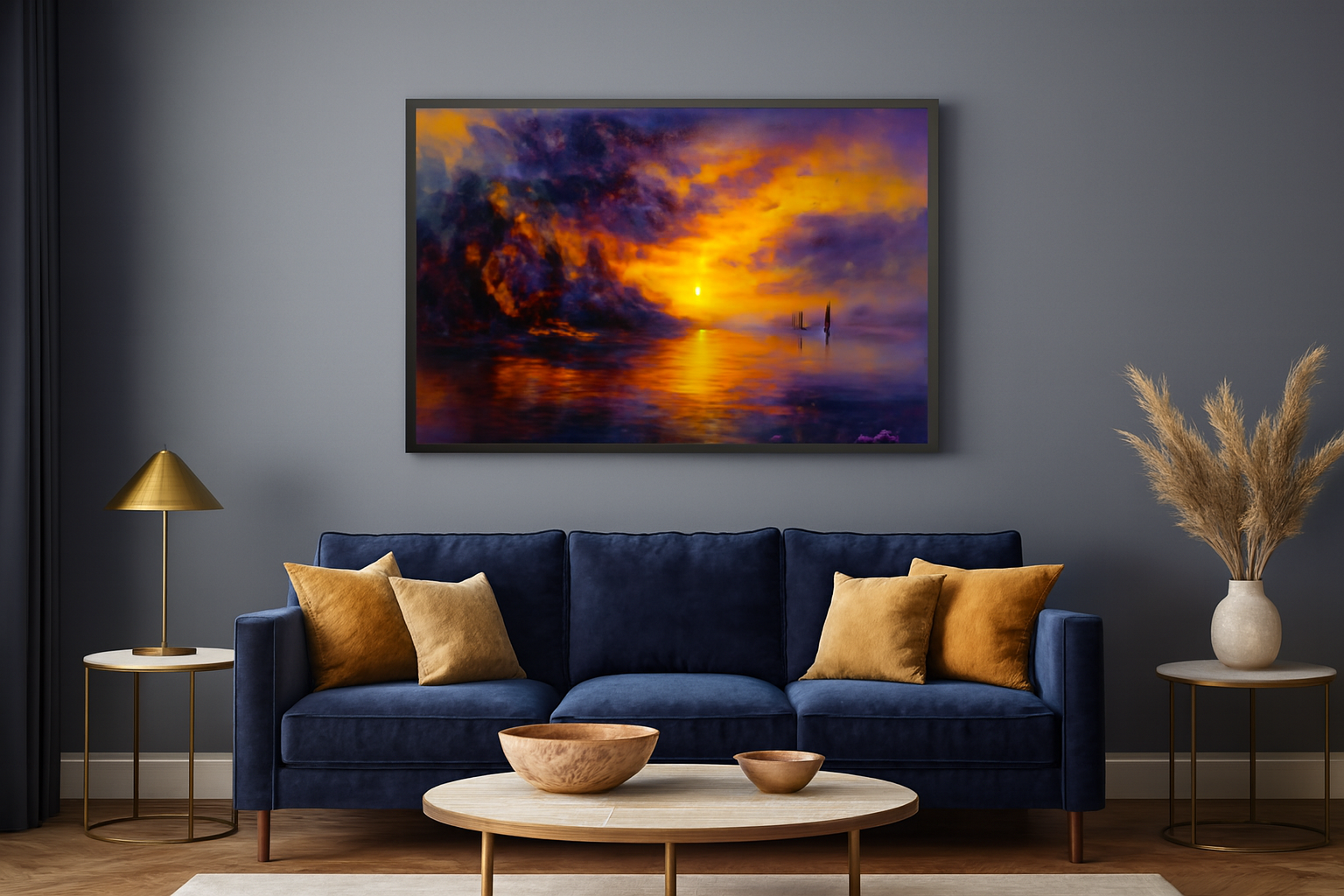 “Harbor of Light: Sailboats Beneath a Burning Sky” captures the breathtaking drama of a fiery sunset reflected across tranquil waters. Vivid purples, golds, and deep oranges swirl through the sky as two sailboats glide toward the glowing horizon, creating a sense of peaceful movement and quiet wonder. Silhouetted trees frame the scene, while distant birds add a touch of life to the expansive dusk atmosphere. This vibrant seascape painting is perfect for collectors who love sunset art, nautical wall décor, and expressive landscape paintings that blend bold color with emotional depth.