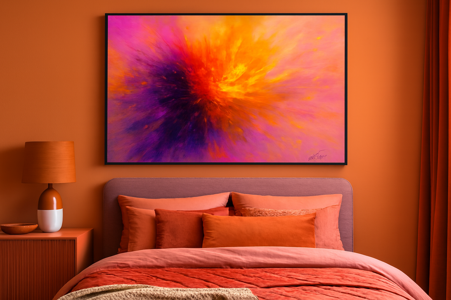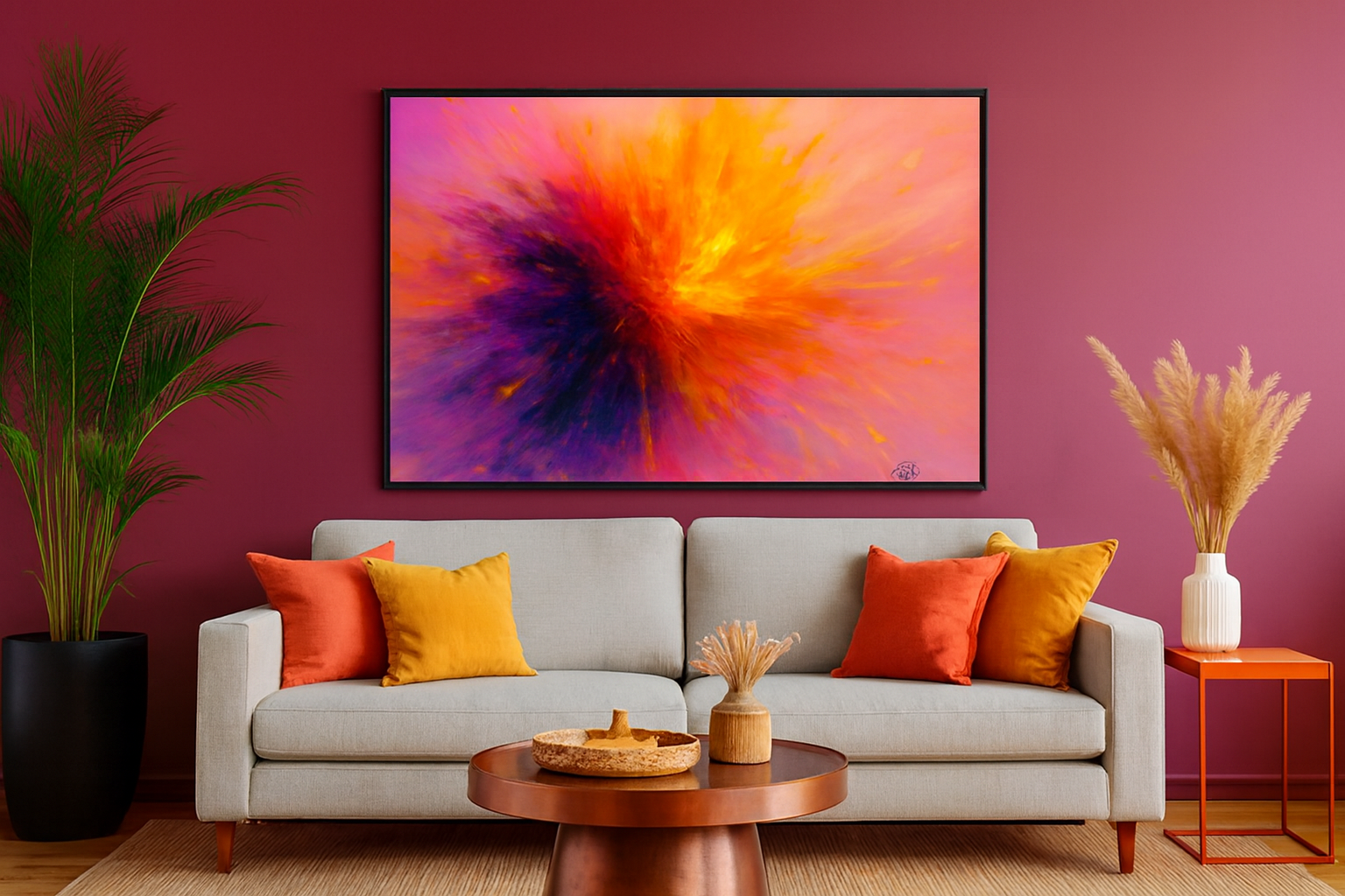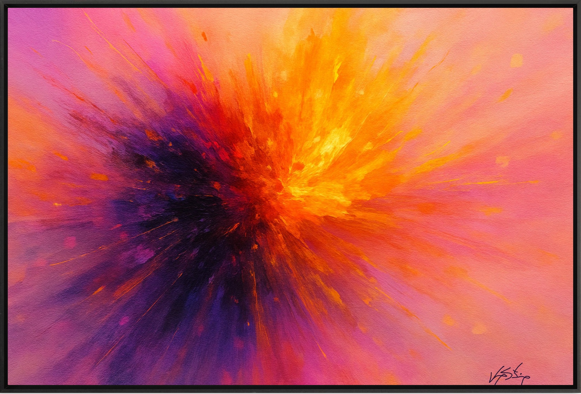 Ignite your senses with Solar Burst, a captivating abstract painting that radiates explosive energy from its fiery core. Vivid streaks of yellow, orange, red, and purple erupt outward in dynamic motion, evoking themes of cosmic ignition and emotional release. The textured brushwork and gradient background of warm pinks and oranges create a sense of depth and intensity, making this piece a powerful focal point for modern interiors or gallery exhibitions. Perfect for collectors of abstract expressionism and lovers of bold, energetic art.
